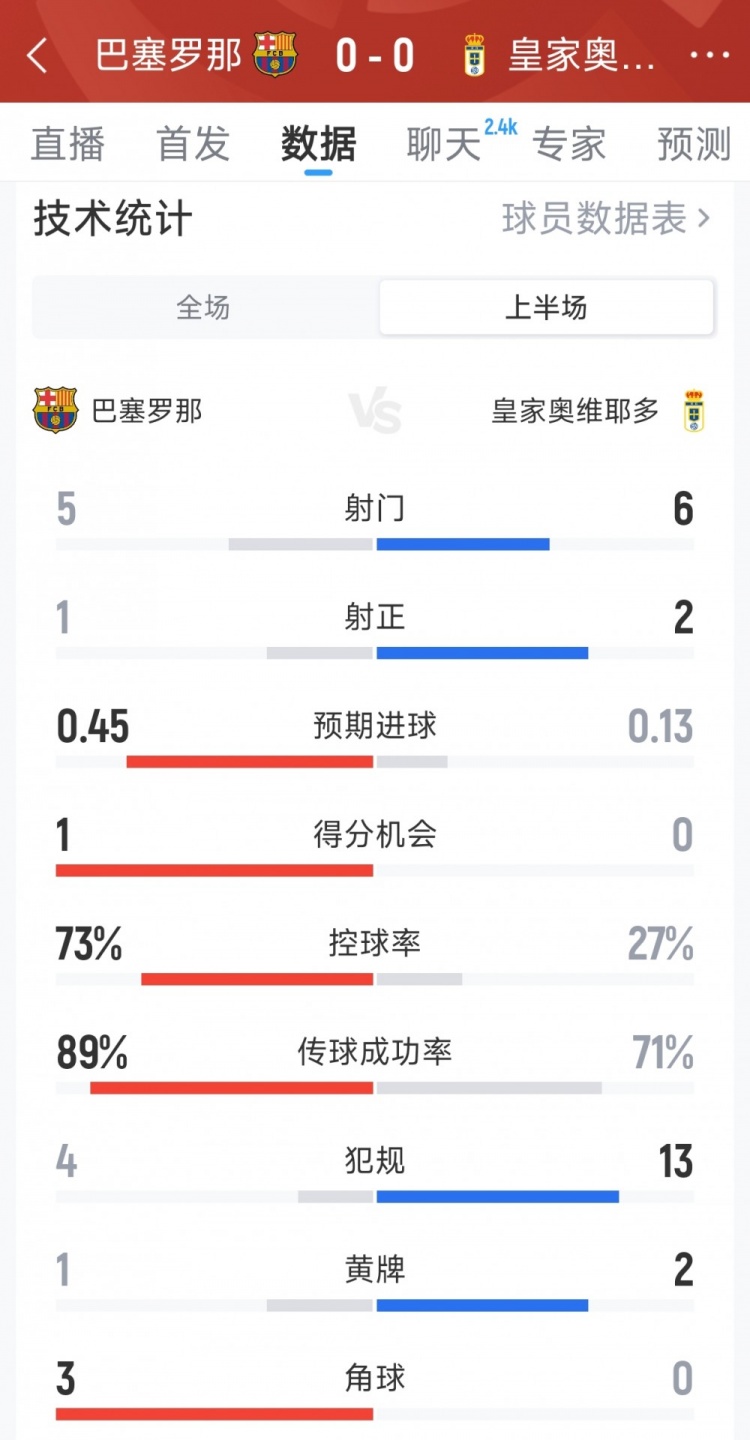 巴萨0-0皇家奥维耶多半场数据:射门5-6,射正1-2,犯规4-13