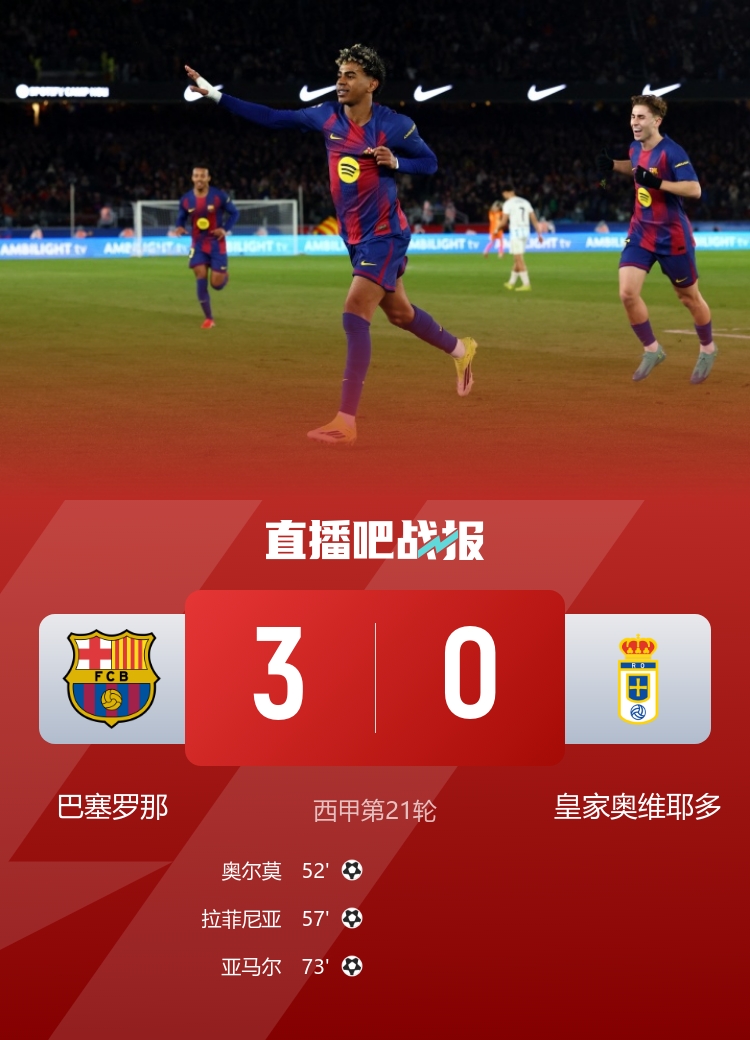 直播吧1月26日讯北京时间1月25日23点15分,西甲第21轮,巴塞罗那在主场诺坎普球场对阵皇家奥维耶多。上半场,莱万错失不错机会。下半场,皇家奥维耶多两度失误送礼,奥尔莫和拉菲尼亚先后进球,亚马尔精彩侧钩锁定胜局。最终巴塞罗那3-0皇家奥维耶多。