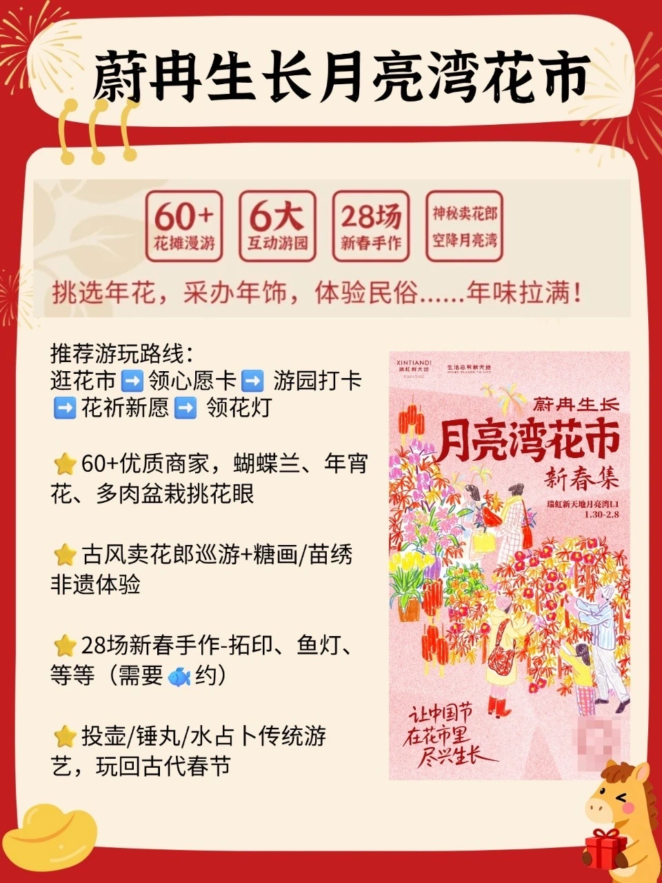 ✅年货集室内温暖,花市户外浪漫,推荐游玩路线:逛花市➡️领心愿卡➡️ 游园打卡 ➡️花祈新愿➡️ 领花灯
