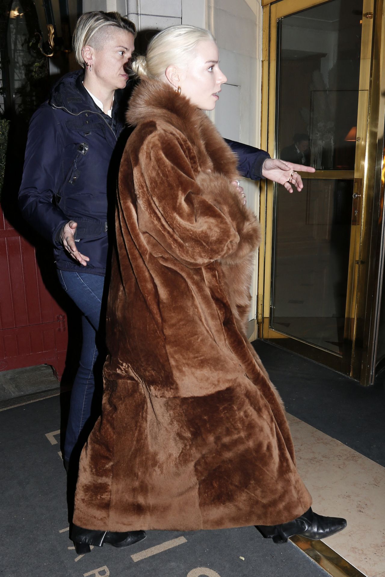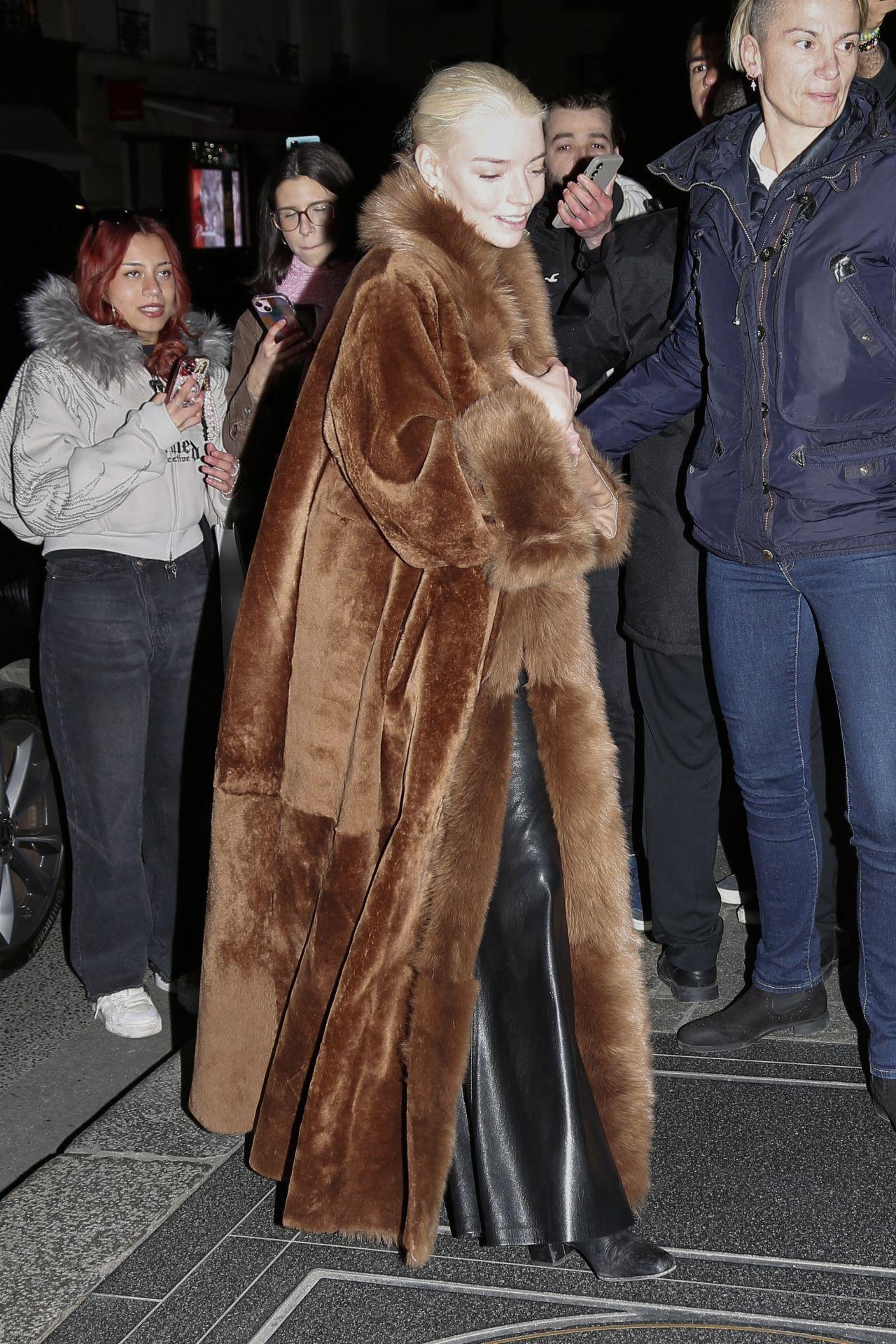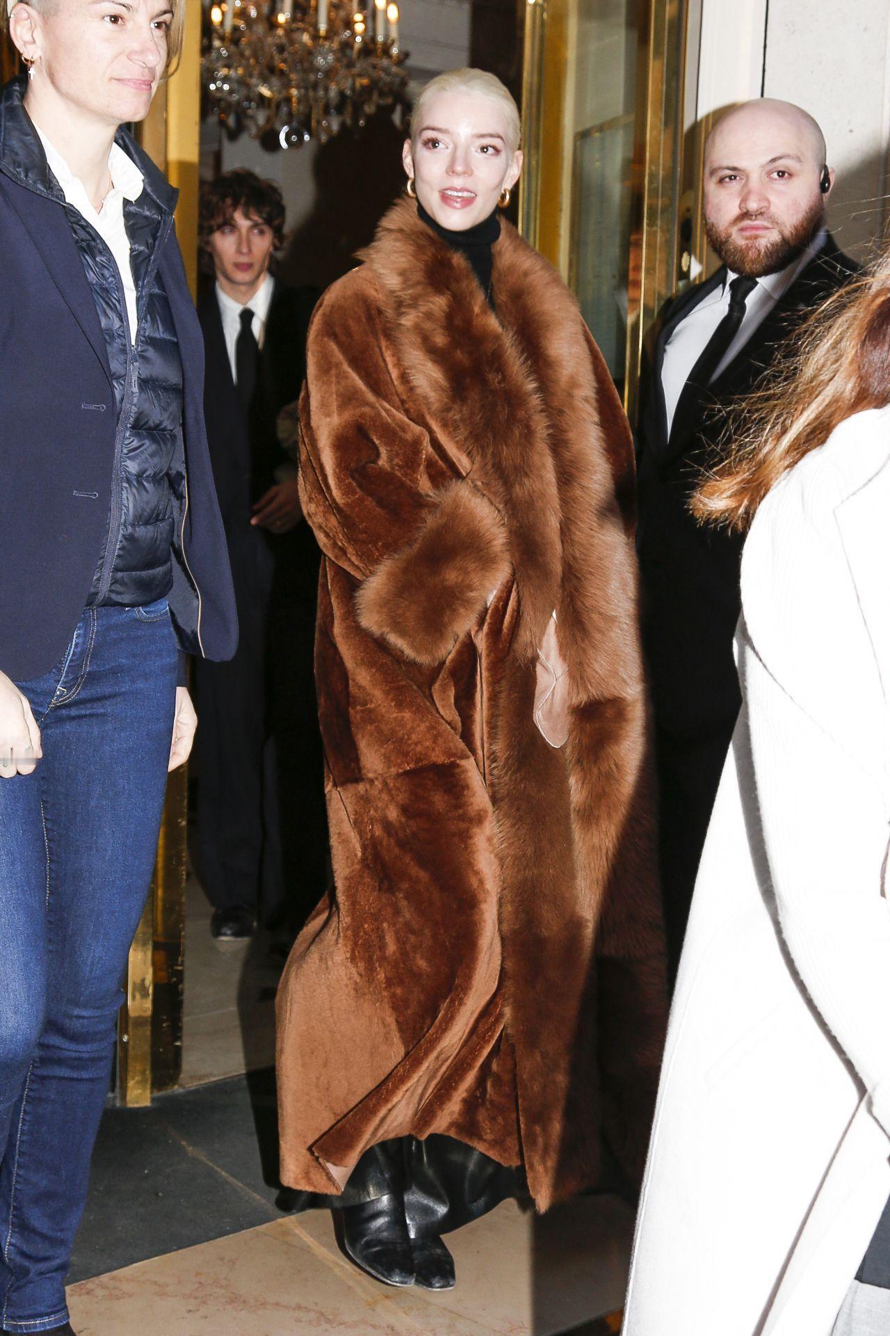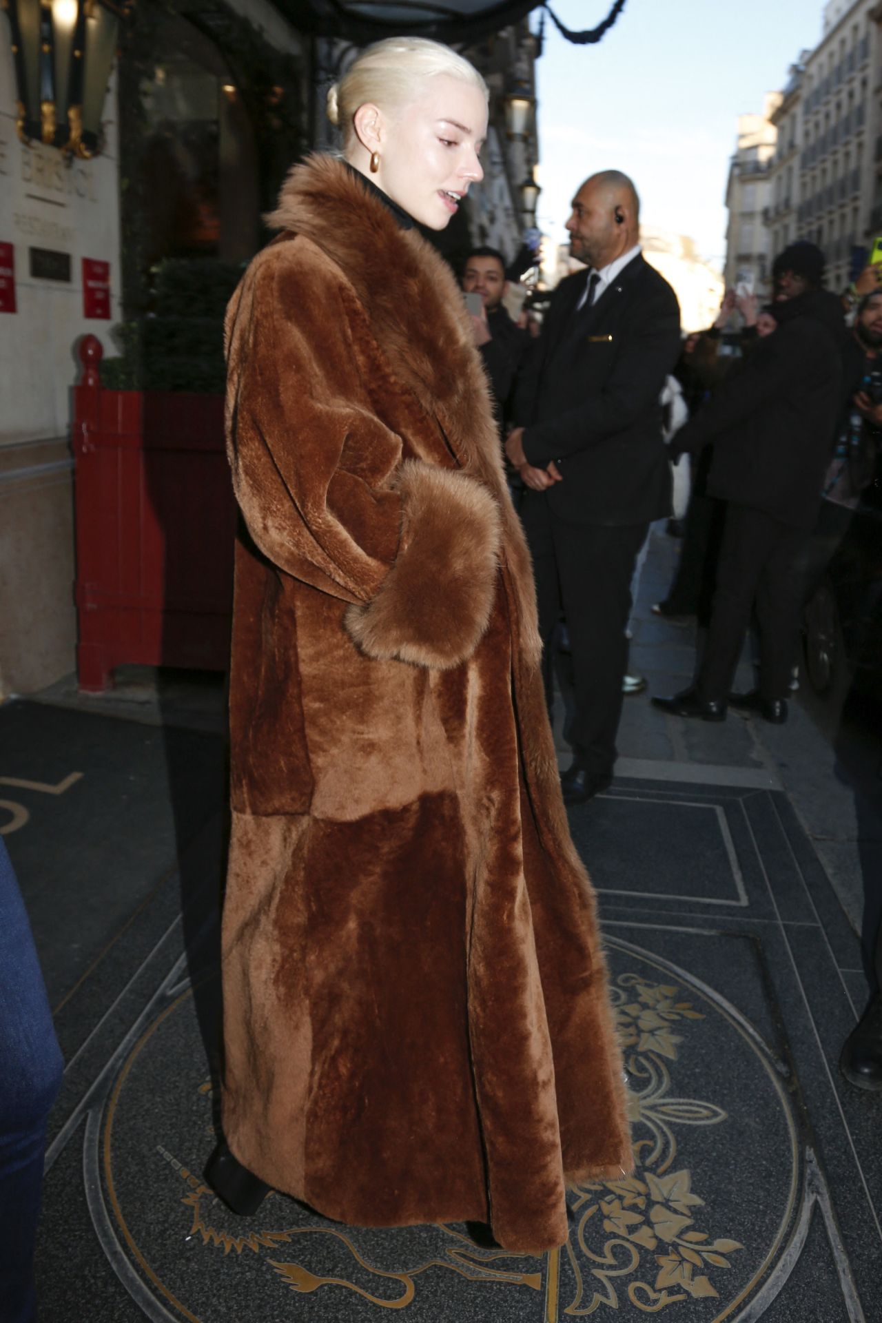 安雅·泰勒-乔伊(Anya Taylor-Joy)于2026年1月24日离开巴黎酒店时,身穿一件长款棕色羊羔毛大衣和黑色厚底靴。