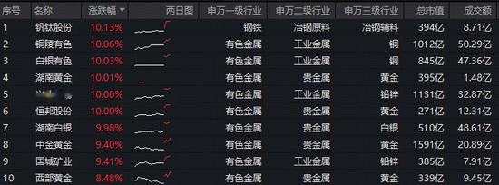 成份股方面,钒钛股份、铜陵有色、白银有色、湖南黄金、兴业银锡、恒邦股份、湖南白银7股涨停,中金黄金、国城矿业、西部黄金等个股大幅跟涨。权重股方面,山东黄金、洛阳钼业涨超7%,紫金矿业涨逾6%。