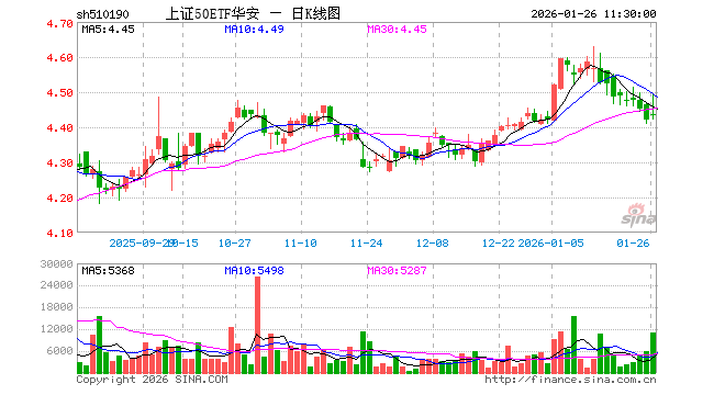 1月26日,截止午间收盘,上证50ETF华安(510190)涨0.34%,报4.435元,成交额489.68万元。上证50ETF华安(510190)重仓股方面,贵州茅台截止午盘跌0.20%,中国平安涨1.85%,紫金矿业涨6.28%,招商银行涨1.47%,兴业银行跌0.94%,长江电力涨0.04%,寒武纪跌2.19%,中信证券涨1.66%,恒瑞医药跌1.32%,工商银行涨0.69%。