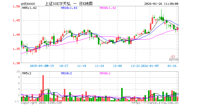 1月26日,截止午间收盘,上证50ETF天弘(530000)涨0.57%,报1.423元,成交额198.59万元。上证50ETF天弘(530000)重仓股方面,贵州茅台截止午盘跌0.20%,中国平安涨1.85%,紫金矿业涨6.28%,招商银行涨1.47%,兴业银行跌0.94%,长江电力涨0.04%,寒武纪跌2.19%,中信证券涨1.66%,恒瑞医药跌1.32%,工商银行涨0.69%。