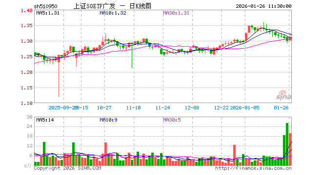 1月26日,截止午间收盘,上证50ETF广发(510950)涨0.77%,报1.310元,成交额2609.29万元。上证50ETF广发(510950)重仓股方面,贵州茅台截止午盘跌0.20%,中国平安涨1.85%,紫金矿业涨6.28%,招商银行涨1.47%,兴业银行跌0.94%,长江电力涨0.04%,寒武纪跌2.19%,中信证券涨1.66%,恒瑞医药跌1.32%,工商银行涨0.69%。