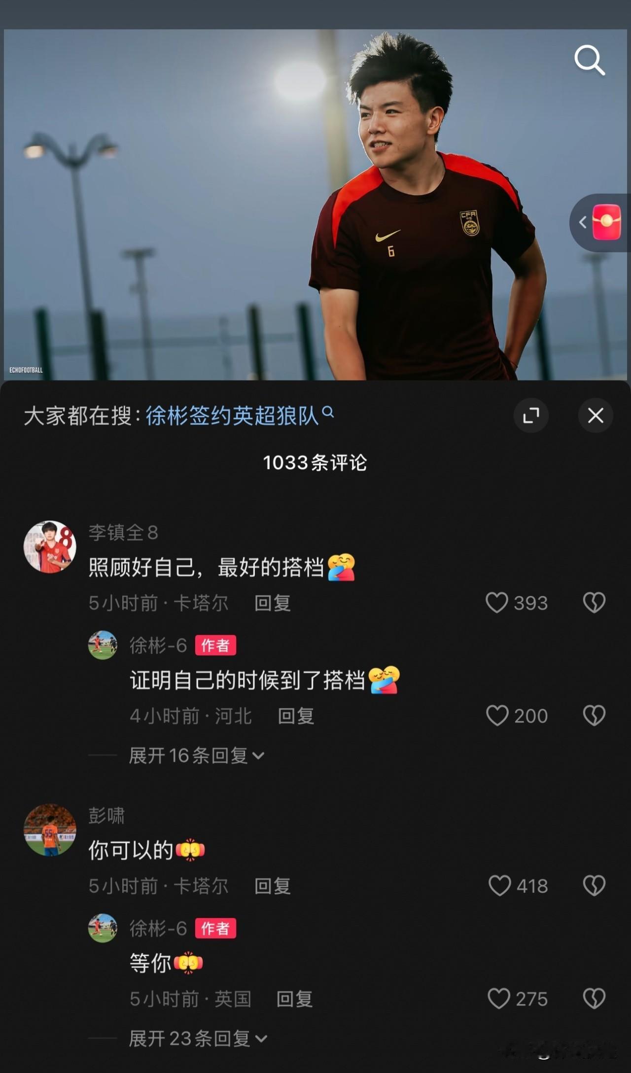 徐彬即将开启留洋生涯,队友纷纷送上祝福。也预祝徐彬留洋生涯顺利。U23亚洲杯决赛