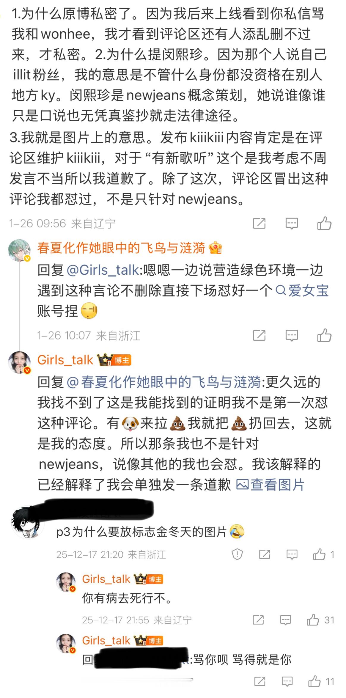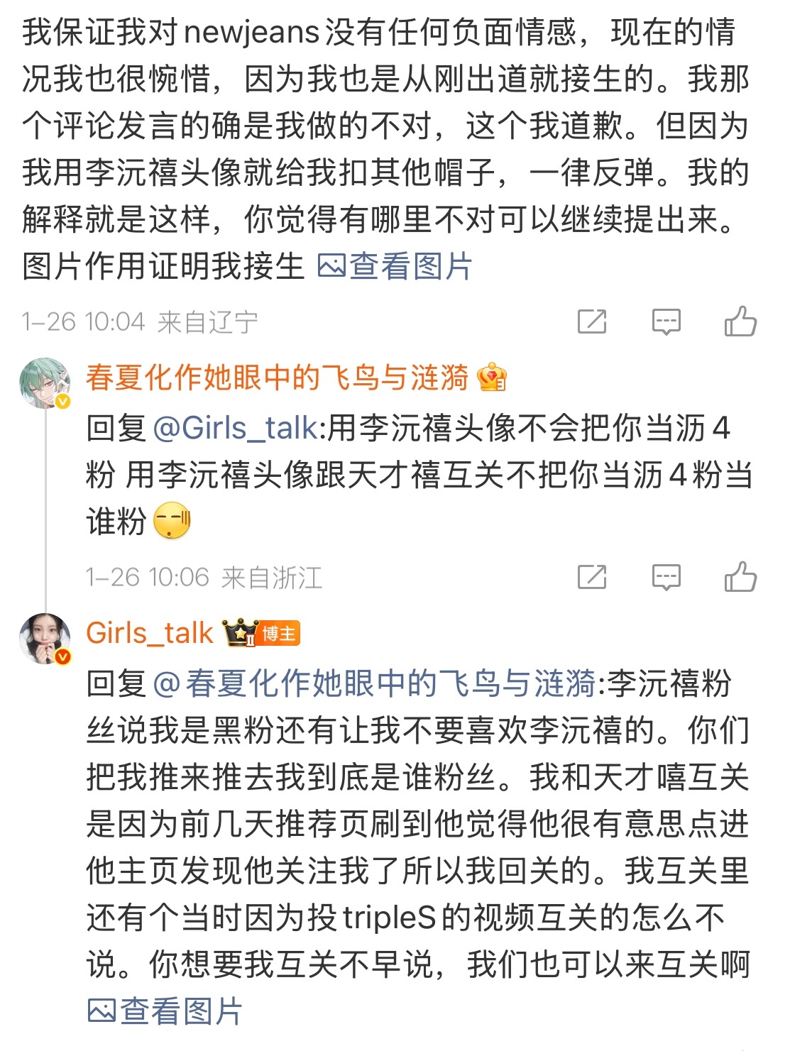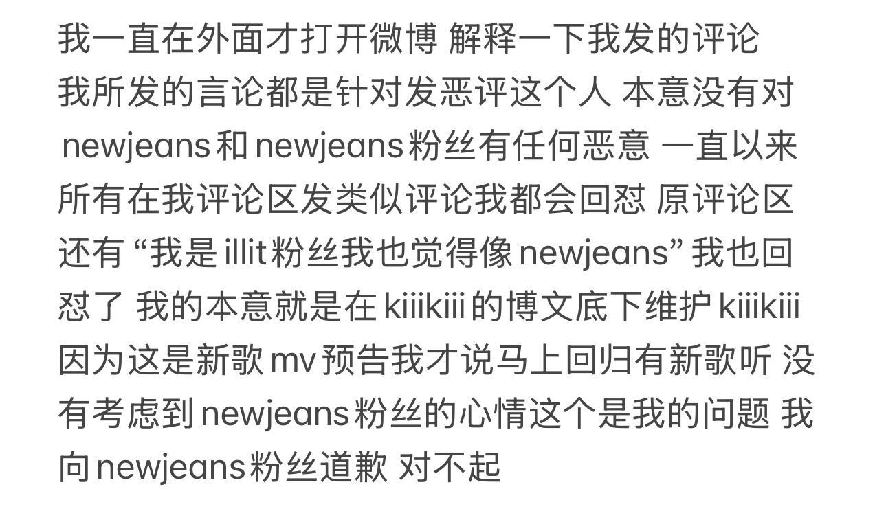 关于我在评论区有不当言论我给newjeans及其粉丝道歉我的本意就是在博文底下维护kiiikiii 因为这是新歌mv预告我才说马上回归有新歌听 没有考虑到newjeans粉丝的心情这个是我的问题 我向newjeans及其粉丝道歉 对不起 更多可以看图片 有任何问题可以在评论区(已设置评论精选只有我能看到)提出我都会解释