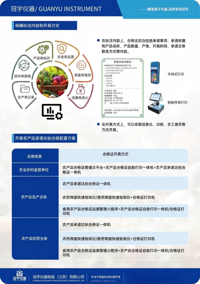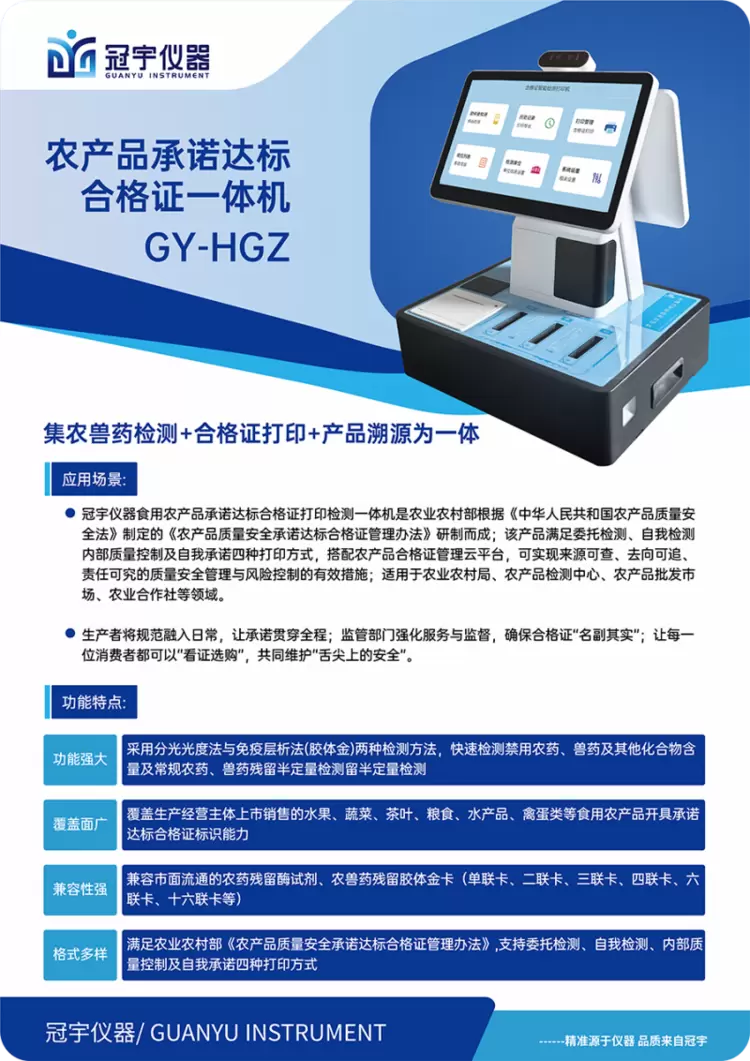 冠宇仪器新推出的“食用农产品承诺达标合格证打印检测一体机”是公司多年技术积累的集中体现,解决了农产品质量安全管理中的关键痛点。
