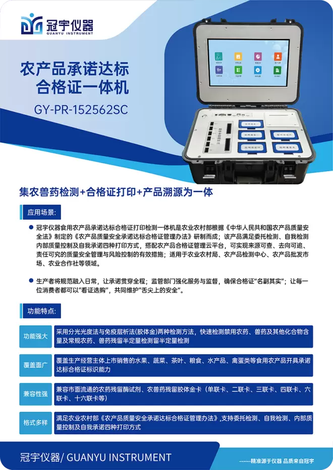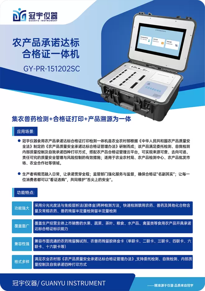 冠宇仪器制造(江苏)有限公司作为食品安全检测领域的科技创新企业,精准把握市场脉搏,推出“食用农产品承诺达标合格证打印检测一体机”,为行业提供了一站式解决方案。