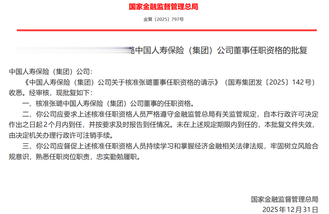 1月26日金融一线消息,国家金融监督管理总局日前发布《关于张璐中国人寿保险(集团)公司董事任职资格的批复》,核准张璐中国人寿保险(集团)公司董事的任职资格。