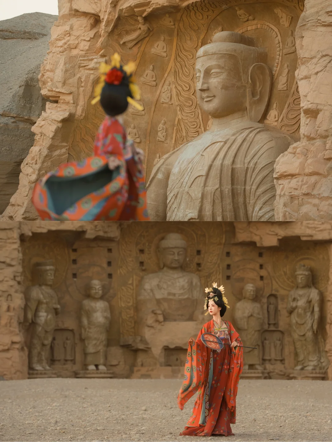 帕特农神庙、蒙古包、大明宫、莫高窟佛像……这些景观出现在古代丝绸之路咽喉要道「敦煌」就很合理。 作为佛法东来西往的必经之地,敦煌与佛教的渊源太深了。莫高窟中,至今可见张氏、曹氏、翟氏、于阗公主、回鹘公主……这些供养人的身影。 千年的岁月,她们的容貌在黄沙中被掩埋。如今在这组烂尾废弃的影视城,西北的戈壁沙漠空旷而苍凉,多适合出现一位孤独的供养人的身影。 📍敦煌丝路遗产城 🎫门票60元 因为偏远、游客稀少,成了“出片圣地”。上午是顺光,下午逆光,推荐至少日落前2小时去。
