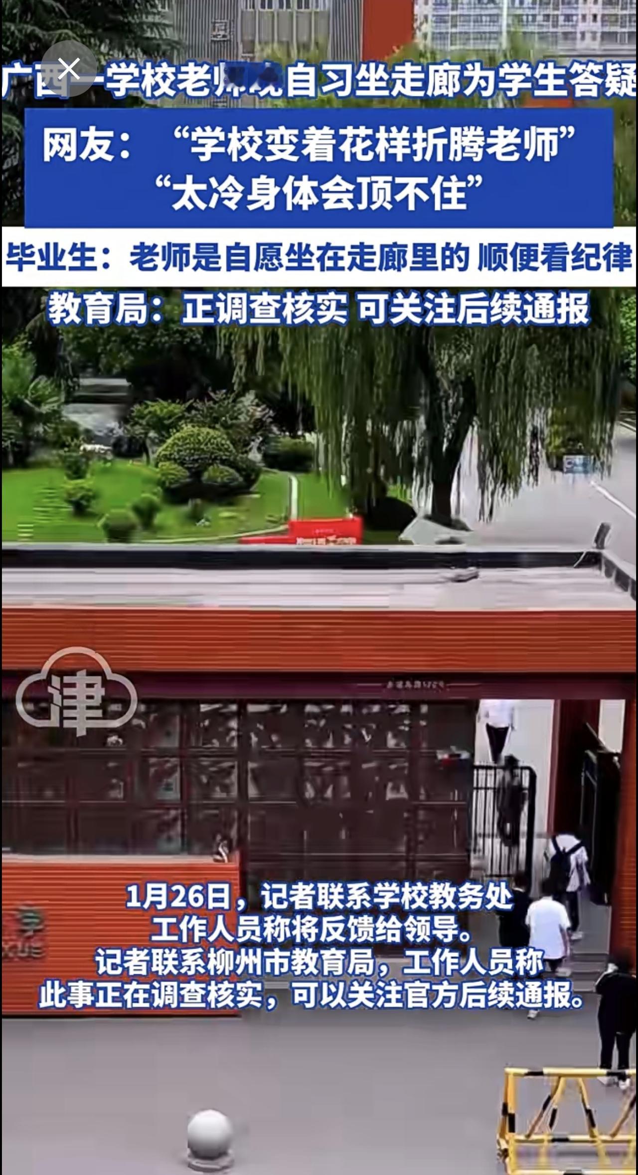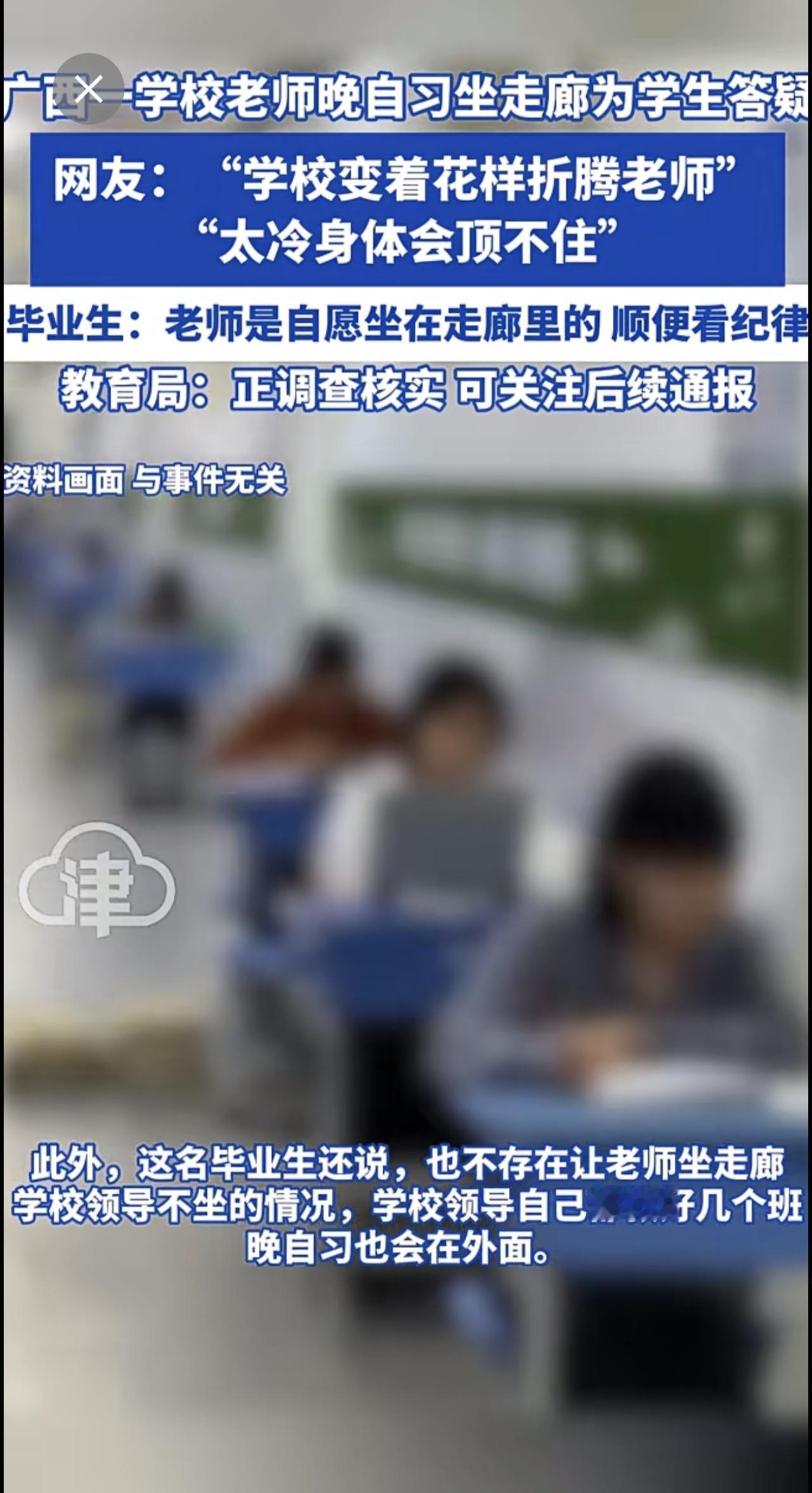 广西一学校老师晚自习坐走廊为学生答疑 网友:"学校变着花样折腾老师"" 太冷身体会顶不住" 毕业生:老师是自愿坐在走廊里的 顺便看纪律 教育局:正调查核实 可关注后续通报