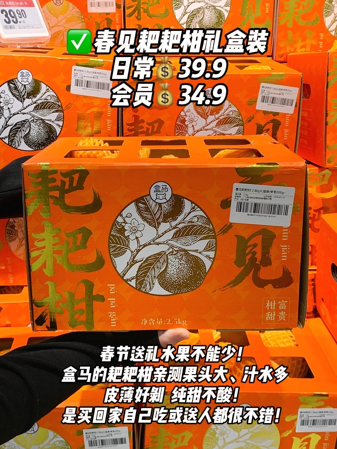 ✅春见耙耙柑礼盒:春节送礼水果不能少!盒马的耙耙柑亲测果头大,汁水多,皮薄好剥,纯甜不酸!送人自己吃都很不错!