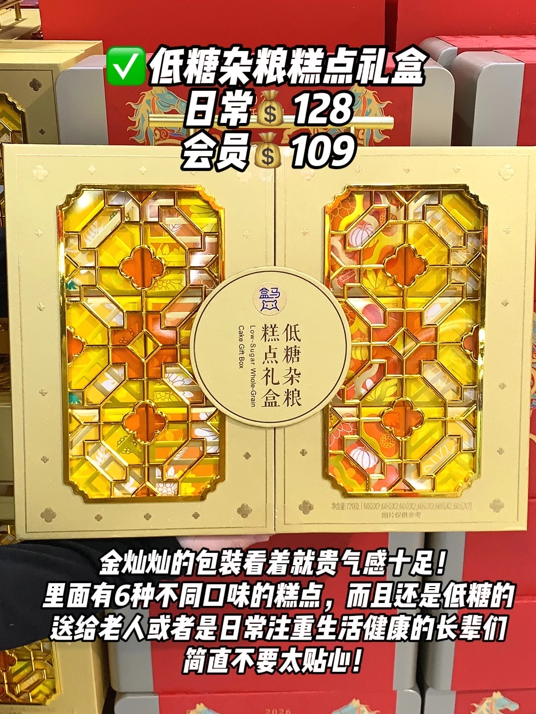 ✅低糖杂粮糕点:金灿灿的看着就贵气感十足!一盒里有6中不同口味的糕点,每一块都精致漂亮!而且还是低糖的,送给老人或是日常注重生活健康的长辈们,都夸你贴心!