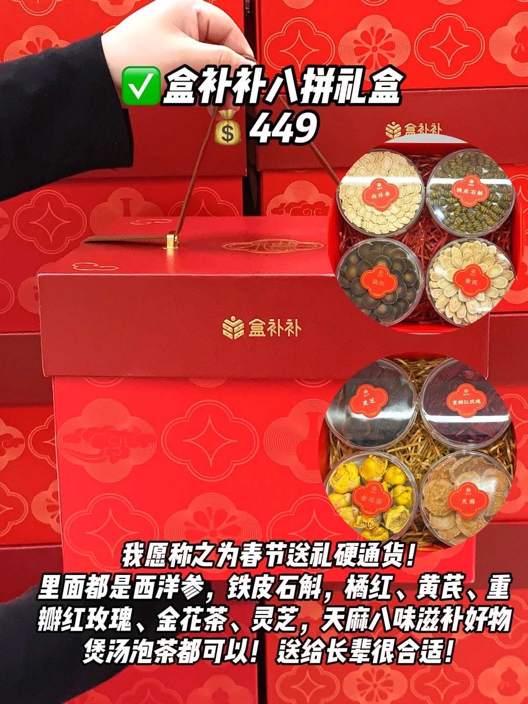 ✅盒补补八拼礼盒:我愿称之为春节送礼硬通货!里面都是西洋参,铁皮石斛,灵芝,天麻等八位滋补好物!煲汤泡茶都可以!送给长辈很合适!