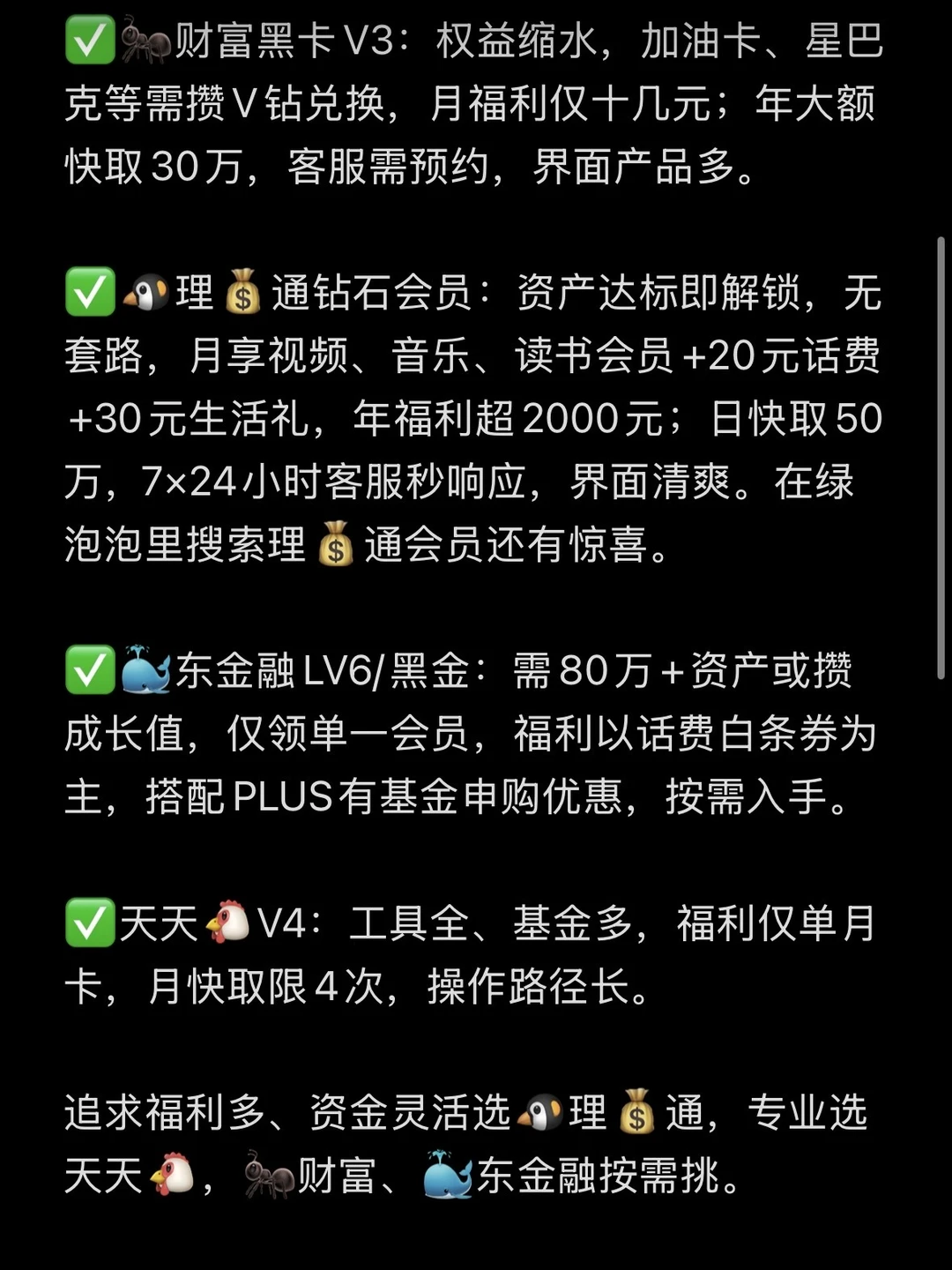 ✅🐜财富黑卡V3:权益缩水,加油卡、星巴克等需攒V钻兑换,月福利仅十几元;年大额快取30万,客服需预约,界面产品多。