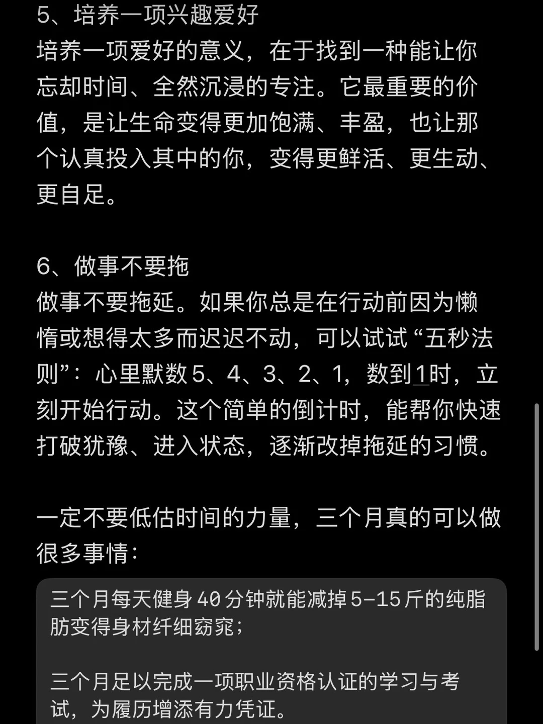 做事不要拖延。如果你总是在行动前因为懒惰或想得太多而迟迟不动,可以试试“五秒法则”:心里默数5、4、3、2、1,数到1时,立刻开始行动。这个简单的倒计时,能帮你快速打破犹豫、进入状态,逐渐改掉拖延的习惯。