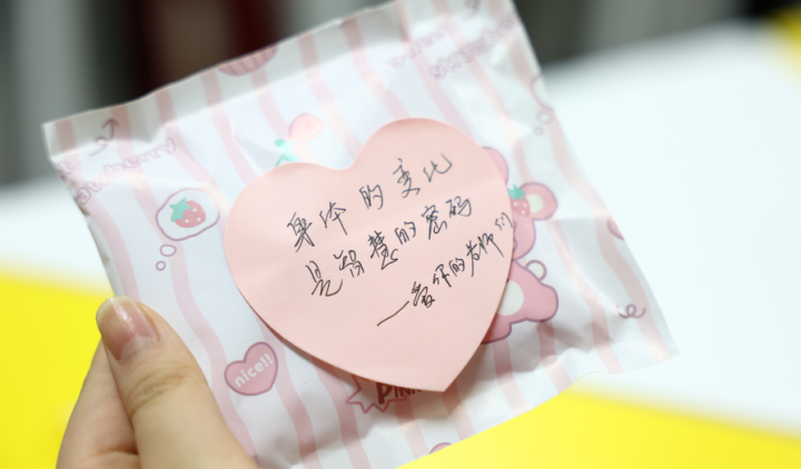 叶老师和梁老师马上开始送出第二份礼物。前一天晚上她们和马老师忙了很久,用可爱的小袋子把买来的品牌卫生巾两片两片地包好,再在粉红色的便签上手写上一句温暖的话,贴在小袋子上。