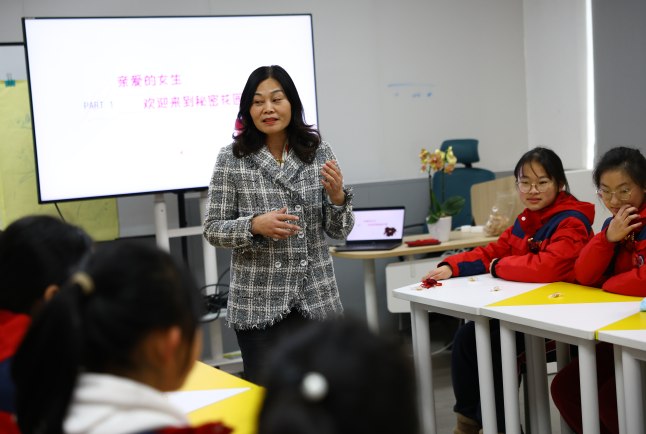 学校家校共育中心主任马琳,也是孩子们的心理老师。孩子们一坐下,她就亲切地一个个询问女孩们来月经时心情是怎样的。有的女生大大方方:“是一件很普通的事情。”有几个女生则说:“有点紧张。”还有女生说,感觉有点烦。