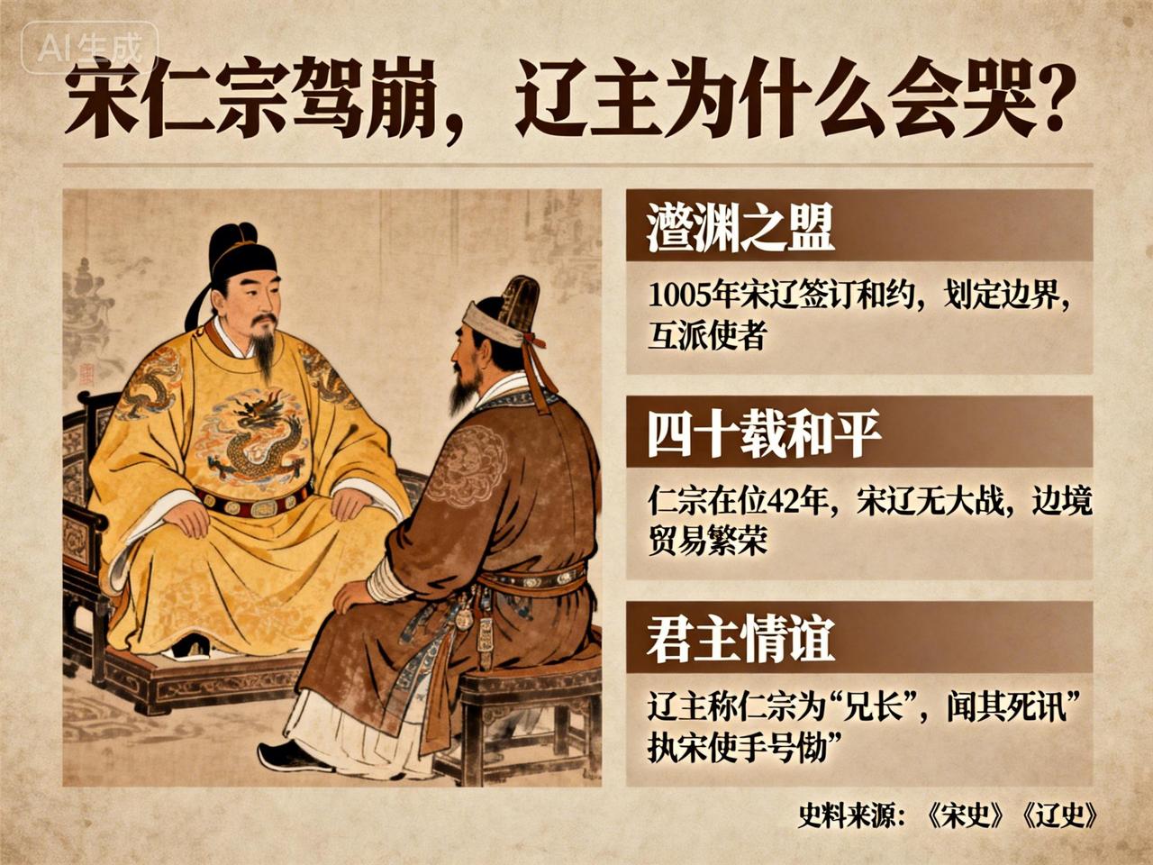 1063年,大宋使者带着宋仁宗驾崩的消息踏入辽国朝堂,辽道宗耶律洪基听完当即抓住使者的手号啕大哭,这位在马背上打天下的铁血君王捶胸顿足:“四十二年不识兵革矣!” 消息传开,辽国百姓无论远近皆聚哭,连燕云边境的榷场都停了交易,人人为这位敌国皇帝哀悼。 谁能想到,对峙百年的宋辽,会因一位皇帝的离世打破敌意?其实辽主的眼泪从不是虚情假意:宋仁宗在位42年,始终坚守澶渊之盟,哪怕辽国趁宋夏战乱施压,他也以增岁币换和平,从未让边境燃起战火。对耶律洪基而言,仁宗不仅是对手,更是守护两国安稳的“定海神针”——辽国的羊能销往宋朝换丝绸,贵族能用上大宋的茶叶瓷器,百姓不用背井离乡当兵,这一切都离不开仁宗的仁厚克制。更难得的是,仁宗的宽仁早已跨越国界,他曾为大宋灾荒戒荤45天,为百姓减免赋税掏空私库,这样的君主,让敌人都心生敬畏。 辽主的哭,哭的是一位懂分寸的对手,哭的是四十年无战的安稳,更是哭一个和平时代的暂时落幕。原来最好的国与国关系,从不是你死我活,而是遇到彼此都愿意守护安宁的人。 互动话题: 1. 你觉得辽主哭的是宋仁宗本人,还是四十年和平? 2. 若每个君主都懂“以民为念”,历史会少多少战乱? 3. 你还知道哪些跨越国界的历史敬意? 宋仁宗驾崩,辽主为什么会哭 宋仁宗 宋仁宗的硬核魅力 辽道宗耶律洪基 宋辽和平 历史的力量