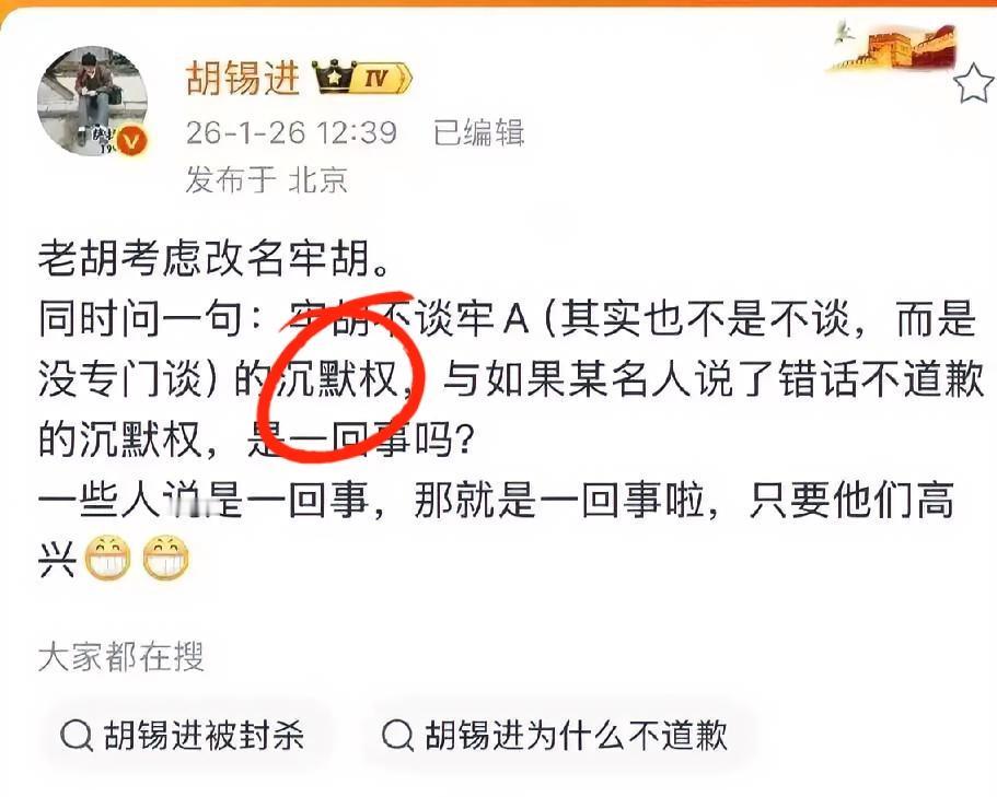老胡勇气可嘉。 胡锡进又厉害了,发文让网友不要混淆是非老胡这逻辑我是真服气,不得不说人家是玩文字的高手。 我就纳了闷了,到了“牢A”那种跌破斩杀线的事儿,或者是“三通一达”那种敏感话题,老胡立马把嘴闭得严严实实,美其名曰“我有沉默权”。 网友说,胡锡进作为宣传界编辑,理当为热点发声,这份责任与担当从不是沉默的理由。 可转头对着董女士,那调门立马变了。 按他的意思,董女士说错话就没资格沉默,必须出来道歉。合着这“沉默权”还是老胡特供的? 对自己宽容得像大海,对别人严苛得像针尖。 我看他这不是为了讲理,纯粹是昨儿上了热搜尝到了甜头,今天想换个姿势再冲一次榜吧?