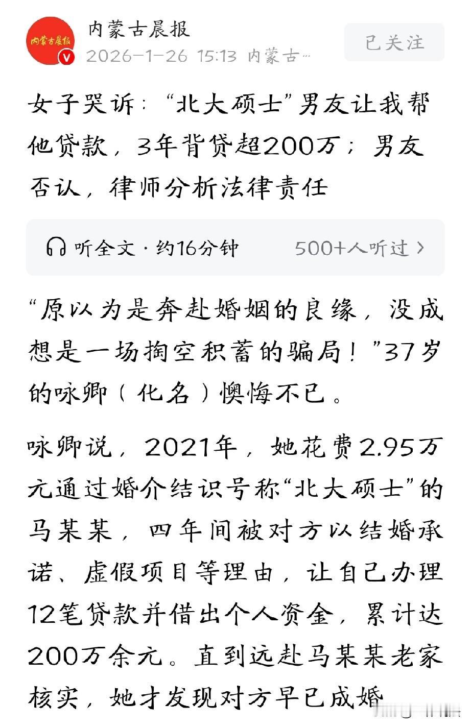 北京,32岁女子花2.95万元,通过婚介中心找了一个男友,对方自称北大硕士,年收入60万,女子非常满意。很快,两人恋爱并同居生活。本以为很快能修成正果,谁知,男友却变着法子让她帮自己贷款,3年下来,女子帮他贷款超过200万。等她贷不出钱来,男子竟翻脸不认人,以“属相不合”为由,提出分手。女子气不过,追到他老家,结果,背后的真相让她大跌眼镜。 2021年,32岁的女子咏卿自觉年龄不小了,为了尽快找到对象,在一家婚介公司支付了2.95万元服务费。 不久后,婚介为她推荐了一位听起来条件优越的男士马某某。 资料显示他是“北大EMBA硕士,年收入60万以上,无婚史,身高183”。这个条件还是相当吸引具有吸引力。 同年4月,两人在婚介安排下见面。马某某能说会道,不断描绘两人未来的蓝图,见父母、买房、结婚等等。 咏卿被这些承诺打动,很快与他确定了恋爱关系,并在几个月后开始了同居生活。 然而,甜蜜的时光很短暂。恋爱关系确定后没多久,马某某就开始以各种理由让咏卿帮忙贷款。 第一次是在2021年6月,他说公司资金周转需要,带着银行工作人员到咏卿公司楼下,劝她测试贷款额度。 咏卿虽然不太情愿,但碍于情面,还是配合了,从那以后,类似的场景一次次上演。 马某某的理由五花八门:有时是公司急需用钱,有时是投资好项目,甚至说“只有最亲密的人才有最好的金钱关系”。 他不仅亲自对接银行,还多次让信贷员上门办理业务。 从2021年6月到2024年9月,咏卿前前后后在12家银行办理了信用贷款,加上她自己的积蓄,转给马某某的金额累计超过200万元。 这几年里,咏卿的生活逐渐被债务压得喘不过气,她非常焦虑,多次向马某某表示自己撑不住了。 但对方总是用甜蜜的承诺安抚她,说这一切都是为了“未来的家”,有时甚至以“不帮忙就分手”来施加压力。 咏卿想着两人是要结婚的,一次次选择了相信和妥协。 为了给这些贷款一个“合理”说法,咏卿按照马某的要求,在2021年至2023年间,与他以及他名下的公司签订了6份所谓的合同和协议,包括劳务合同、股权转让协议、合伙投资担保书等。 这些文件看起来正规,约定了月薪、股权收益等,但实际上咏卿从未真正收到过约定的报酬,所谓的投资项目也从未落地。 2025年2月,马某某突然以“属相不合”提出分手。 其实,咏卿其实已有预感,因为自从2024年9月最后一笔贷款办完,她再也借不出钱后,对方的态度就明显冷淡了。 在父母提醒下,咏卿于2025年清明节假期按马某某曾给的地址,亲自去了河南驻马店他的老家。 当地村民的话让她如坠冰窟,原来马某某早在2019年就已经结婚了。 回到北京后,咏卿找马某某对质,对方起初口头答应按月还款,但从未履行,2025年4月,咏卿一气之下报了警。 马某某得知后,跑到她的公司纠缠,甚至试图让她签虚假合同来抵赖债务。 到了10月,银行因贷款逾期将咏卿起诉,她再联系马某某时,发现所有联系方式均被拉黑,对方彻底失联。 报警之路也不顺利。2025年4月,警方最初认为属民事纠纷不予受理。 经咏卿补充证据后,9月5日案件被受理,但仅四天后,她就收到了不予立案通知书,理由是“没有犯罪事实”。 咏卿推测,这可能与她之前签署的那些“合同”有关,尽管那些文件在她看来只是马某某用来伪装借款的幌子。 在梳理转账记录时,咏卿发现部分款项并未直接进入马某某账户,而是经一位张先生中转。 记者联系到张先生,他坦言自己只是被马某某利用来“过账”,并称自己也是受害人,被马某某以各种项目名义骗过钱。 此外,他也证实马某某确实已婚,且早在2019年就在北京办了婚礼。 面对询问,马某某全盘否认与咏卿的恋爱关系,称两人只是“合伙投资”,否认让咏卿贷款给自己用,并称双方签有股权代持协议,每月都在“回购股份”。 对于自己的婚姻状况,他避而不谈,只说“与此事无关”。 如今,咏卿背负着巨额债务,手里只有一堆未能兑现的合同和转账记录。 她最初只为寻一段良缘,最终却落得人财两空。 而关于这些钱款的性质究竟是“借款”还是“投资”,对方的行为是否构成诈骗,依然是一个待解的难题。 谈恋爱先看人品再谈条件,甜言蜜语画大饼的多半藏猫腻,一旦恋涉及到大额钱财,一定要清醒警惕,守住底线。
