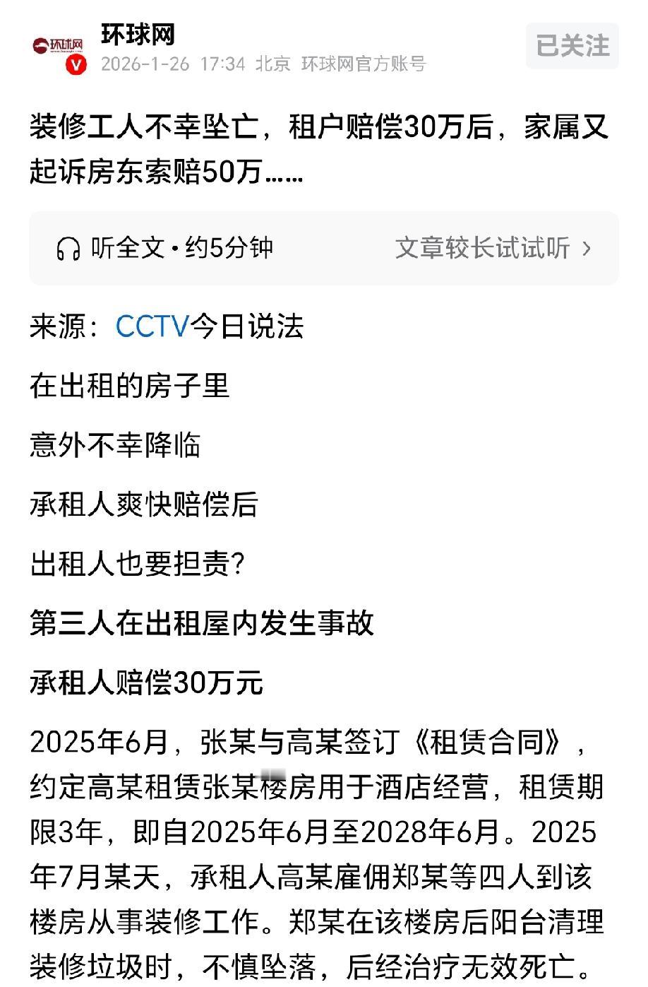 “想钱想疯了!”山东临沂,男子给某酒店清理装修垃圾时,不小心从5米高的阳台坠落,最终抢救无效身亡。酒店老板为了息事宁人,和男子家属达成协议,赔偿其30万元。拿到赔偿款后,男子家属得知酒店房子是租来的,于是又把酒店房东告上法庭,还索要50万的赔偿。酒店房东很无奈,这和他有什么关系,简直是躺着中枪,不赔! 2025年6月,张某把自己的一栋楼房租给了高某,两人一次性签订了3年的租赁合同,从2025年6月到2028年6月。 高某打算用这房子开酒店,签完合同没几天,高某就开始急着开始酒店的装修,想着早点投入运营。 为了提高装修效率,高某雇了郑某等四个人一起来做装修清理工作,想着赶紧把房子收拾好。 万万没想到,一个简单的装修,竟然能闹出人命。 男子郑某干活一向实在,接到清理后阳台装修垃圾的活儿,撸起袖子、拎着工具就上了阳台。 郑某想着赶紧把垃圾清完,早点收工,完全没太留意阳台边的安全细节,只顾着埋头干活。 清理到一半,郑某看到阳台和下方河道之间有个直梯,入口处盖着块铁板,他以为铁板下面是垃圾,顺手就把铁板掀开了。 不料,掀开铁板后,郑某脚下没了支撑,加上阳台离河道有5米高,他一个没站稳,直接从阳台坠落到了河道边。 等工友发现时,郑某已经摔得不轻,虽然第一时间拨打了120送医,可还是没能救回来,当天下午三点多,医院就宣布了郑某死亡。 派出所接警后也赶到现场勘察,确认郑某是清理装修垃圾时掀开直梯入口铁板,不慎坠落身亡的,排除了刑事案件可能。 郑某突然离世,家里人悲痛欲绝,好好的人出去干活,转眼就没了,家属们又伤心又气愤,第一时间找到了酒店老板高某。 高某心里也慌,毕竟人是自己雇来的,在自己租的房子里出了事,要是闹大了,酒店开业肯定受影响,还得惹上一堆麻烦。 他想着赶紧息事宁人,别让事情越闹越大,就主动跟郑某家属谈赔偿。 双方谈了几次,最终签了《意外死亡和解协议书》,高某一次性赔30万,涵盖死亡赔偿金、丧葬费等所有费用。 高某也爽快,很快就把30万赔偿款打给了郑某家属,家属拿到钱后,心里的悲痛稍微缓解了些,也暂时没再找高某的麻烦。 可没过多久,郑某家属偶然得知,高某开酒店的房子根本不是他自己的,是从张某手里租来的。 郑某的家属们又打起了算盘:既然房子是张某的,那他作为房东,是不是也得担点责任? 租客都能给30万,房东更有钱,更应该多给一点,郑某家属想着能再从房东手里要一笔,弥补点家里的损失。 抱着这样的想法,2025年10月16日,郑某家属把房东张某告上了法庭,要求他再赔偿死亡赔偿金、丧葬费、精神抚慰金等共计50万元。 张某接到法院传票时,简直一头雾水:我把房子租给高某,他怎么经营、怎么雇人干活,我根本管不着,人是在他装修时出的事,跟我有什么关系?这不是躺着中枪吗?这钱我绝对不赔。 法庭上,张某据理力争,说自己早就把房子租给了高某,事故发生时,房子是高某实际占用、使用的,自己作为出租人,没理由承担责任。 法院也仔细核查了案件细节。 首先,案涉房屋在2025年6月20日就租给了高某,郑某坠亡发生在高某实际占用期间,房屋的使用、管理责任已经转移给了高某。 其次,房屋本身没有倒塌、塌陷等质量问题,郑某坠亡是因为自己掀开铁板不慎坠落,跟房屋本身无关。 再者,高某作为实际使用人,已经和家属达成和解,赔了30万,家属也拿到了全部赔偿款。 综合这些事实,法院认为郑某家属要求张某赔偿50万元,没有事实和法律依据,最终判决驳回了他们的诉讼请求。