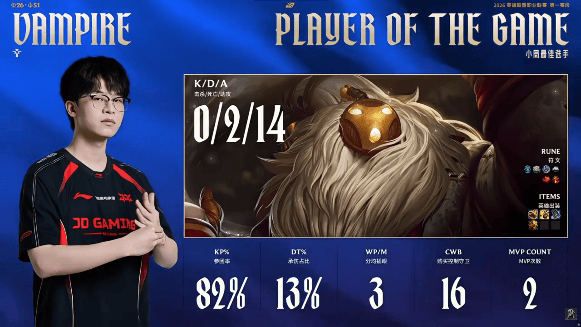 Vampire巴德砍下0/2/14的战绩,拿下JDG对阵BLG决胜局MVP