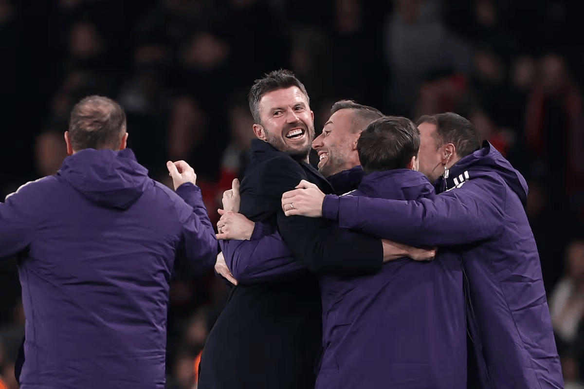 从弗莱彻手中接过教鞭以来,卡里克始终沉着自若。他行事低调,不事张扬,双脚如此坚定地扎根地面,让人几乎怀疑他迈步时是否需要额外用力。周日的边线旁他鲜少流露情绪,直到终场哨响才在客队看台前活跃起来——他的两个孩子就在三千名远征球迷之中。