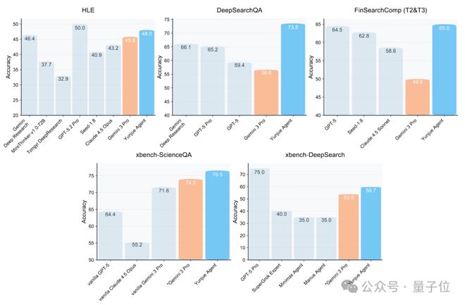 全方位碾压基于Gemini3Pro的Agent,在需要复杂检索与推理的任务中,甚至能高出十余个百分点。