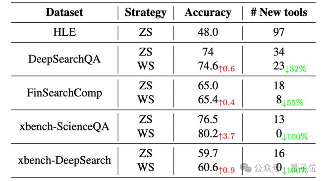 再看这张图更直观——两种策略下的Agent性能统计对比,ZS代表从零工具起手,WS代表前面说的按数据集顺序的知识迁移策略。