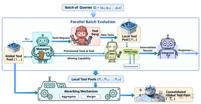 基于上述思考,团队以「工具优先」为理念,打造了一支可实现原位自进化的Agent军团