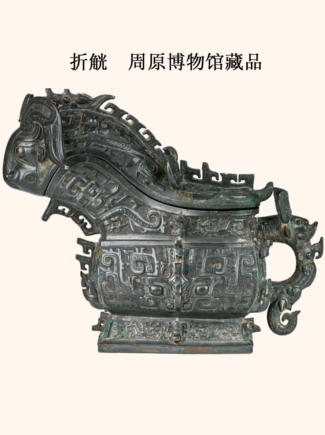 1976年12月15日,庄白村村民在平整土地时,一个偶然的发现震惊了考古界,这就是庄白一号窖藏。 庄白一号窖藏,共出土青铜器21种、103件,其中有铭文的达74件,被誉为新中国成立以来出土青铜器数量最多、学术价值最高的一次重大发现。 今介绍庄白一号窖藏出土的一件青铜器,现藏于宝鸡周原博物馆的折觥。 器物名称:饕餮纹兽形觥(博物馆展牌名称:折觥) 时代:西周早期后段(康昭时期) 收藏单位:宝鸡周原博物院 器物规格: 通高287厘米,通长38厘米,腹深12.5厘米,口长径11.8、短径7厘米。重6.7kg 出土地点: 1976年扶风县法门镇庄白村1号窖藏出土。 器物介绍: 器形: 整器似兽形,分为盖部与器身两部分。器盖分首、身、尾三部,器身分颈、腹、圈足三段。器敞口,颈微束,腹部微鼓,圈足稍外侈。 纹饰: 整器满花浮雕,立体感较强。盖首端为一兽首面,圆雕羊角向下弯曲,,上饰阴线纹;高鼻鼓目,两齿外露,两角之间置一圆雕龙首,从龙首处开始,在盖脊正中延伸一条扉棱,饰为龙身,直到盖身后部饰圆雕向上卷曲龙尾:盖身饰二组大回首夔龙纹,以扉脊为界。盖尾部亦饰一饕餮纹雕饰,圆雕兽角内卷曲,角面饰两对视的卷鼻卷尾夔龙纹,饕餮圆面,叶形耳,粗眉圆目,嘴角内卷,鼻前端向前凸起;盖尾部出圆雕兽尾示器盖部兽尾。器身扉棱将纹饰分为四个部分,颈部饰一大回首夔龙纹,扉棱后饰一小回首夔龙纹,腹部前后两面各饰竖体夔龙纹,前部以扉棱为界,后部有鋬,以阴线刻蝉纹为界;器身两侧面各饰一组大饕餮纹,以扉棱为界;圈足上饰四组两两相对的回首卷尾夔纹,圈足侧面两组夔纹较长,前后面两组夔纹较短。整器以雷纹衬地。 铭文: 器盖同铭四十字,器铭六行,盖铭四行,铭文:隹(唯)五月,王才(在),戊(子),令乍(命作) 册折兄(贶望)土于相(侯),易(锡)金易(锡)臣,(扬)王休,隹(唯)王十又(有)九祀,用乍(作)父乙(尊),(其)永寳。木羊册。 铭文大意:昭王十九年五月戊子这天,王在沣京一带,命作册折去给相侯代天子赠望土,同时,昭王又给折赏赐了许多铜和奴隶,为宣扬王的美德和恩惠,折为祭告父亲乙,便铸造了这件觥,以作纪念。