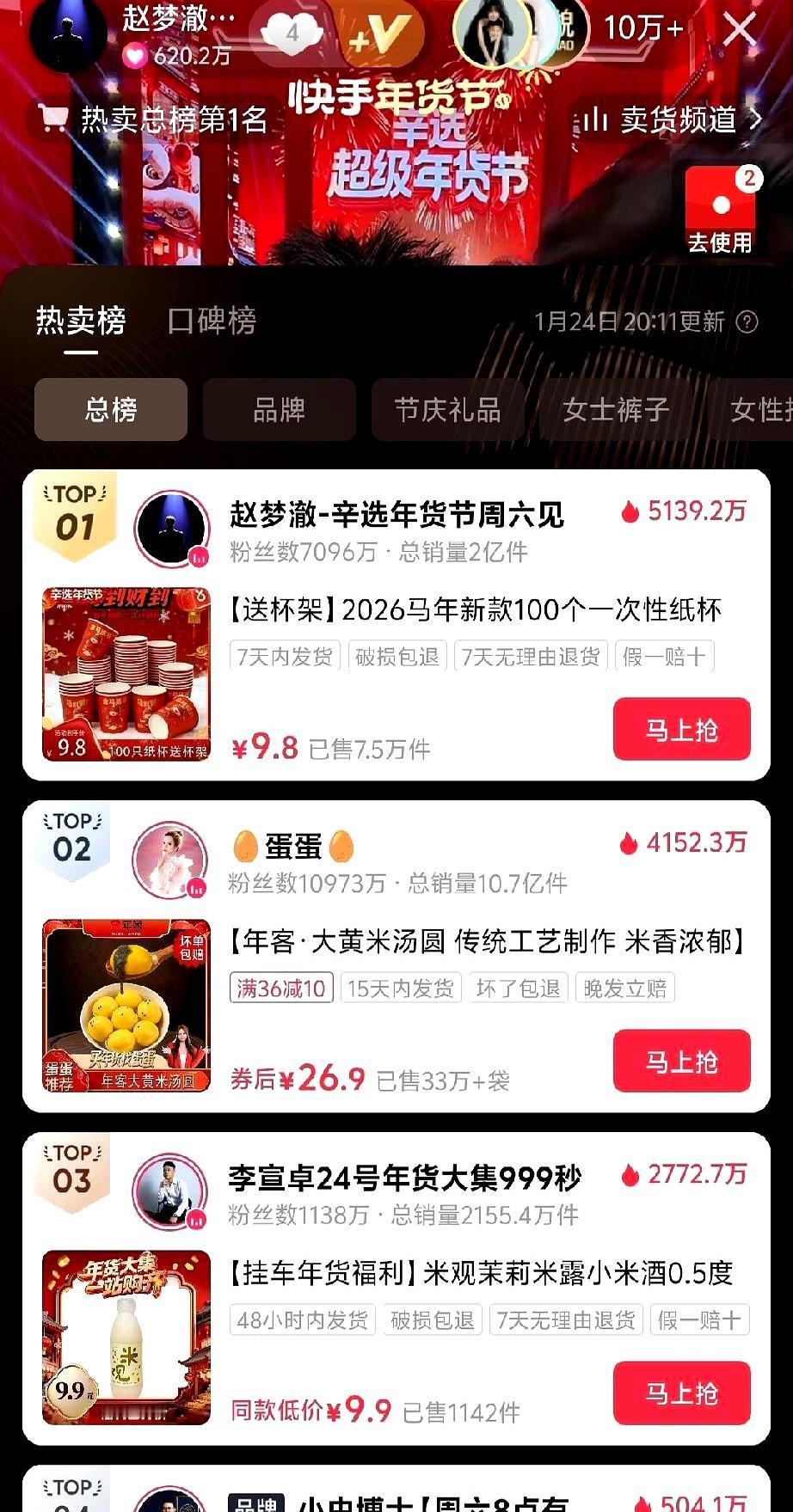 年货节打到一半,赵梦澈已经抡出6个亿,安井鱼丸秒掉1000万袋,直播间热度直接封顶。 曾经的“一姐”蛋蛋呢?停播4个月掉了276万粉,回来只能单干,55亿GMV虽猛,却得自己扛房租人工。 辛选这招叫“去头部”,把流量往赵梦澈身上灌,蛋蛋的奢侈美妆不再吃香,低价民生才是新王道。 说白了,师徒情在KPI面前不值一提,谁卖得多谁坐C位。赵梦澈冲得猛,也被罚过200万,说明规矩还得守。 蛋蛋自立门户,粉丝过亿,江湖地位还在,只是从今往后,拼的不再是师门光环,而是自己能不能把货讲出花。