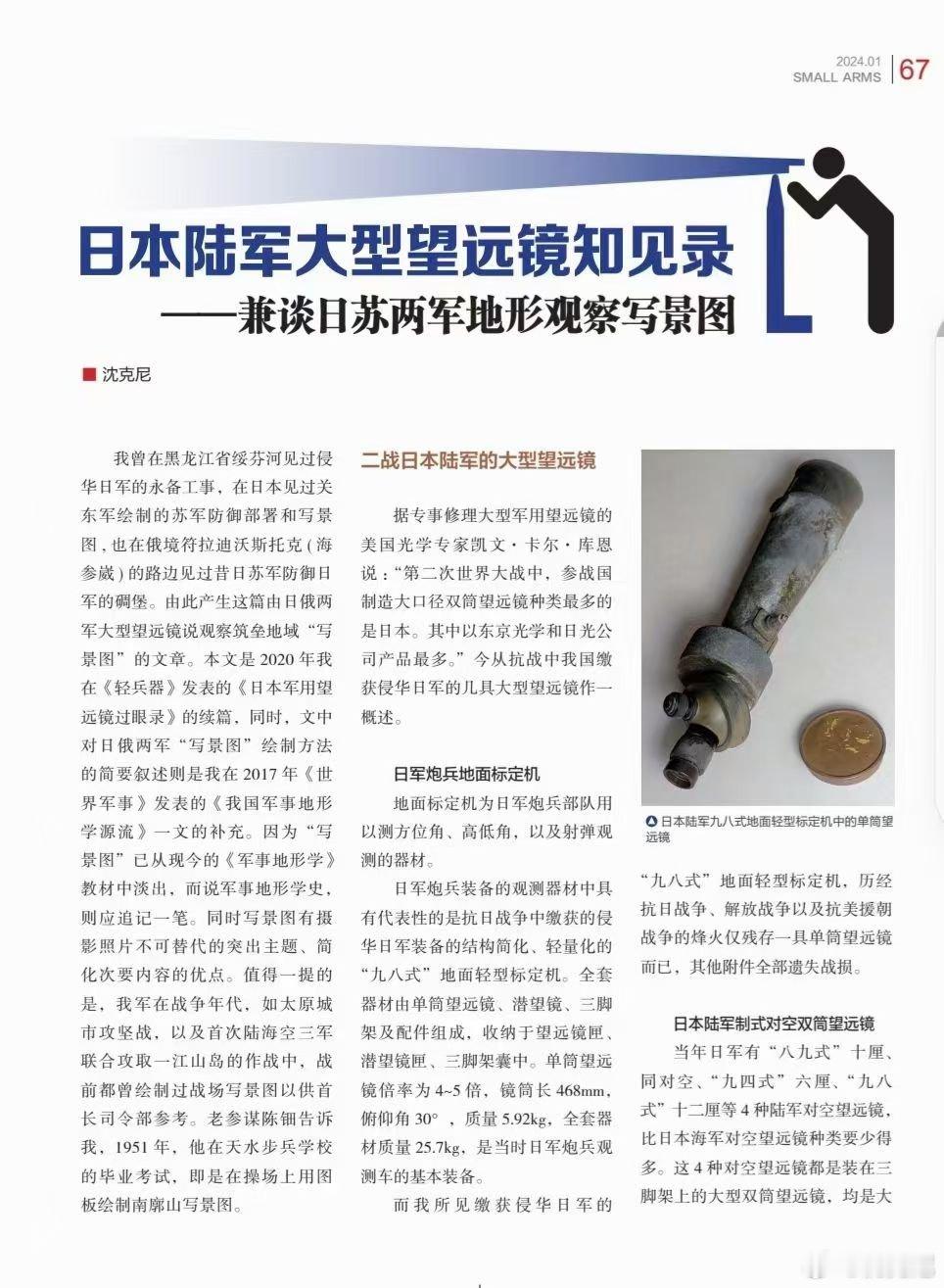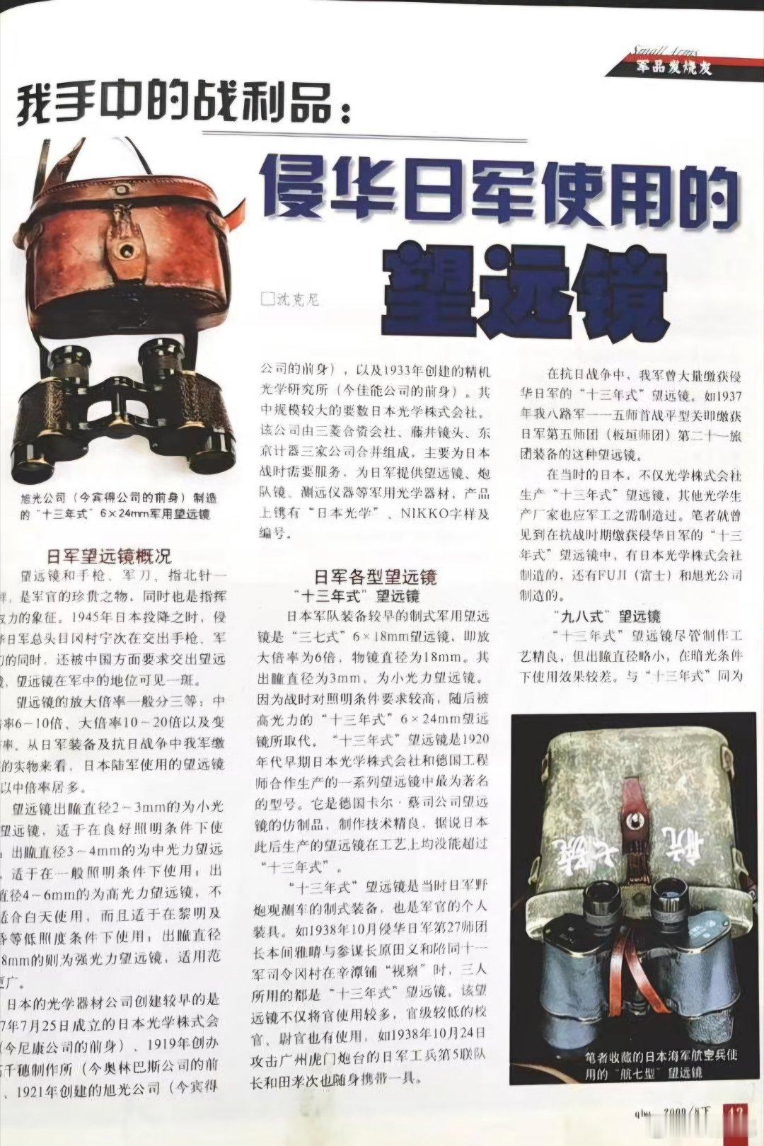 我琢磨望远镜是茶余饭后,爱乌及屋的兴趣。 二战中日本8倍的军用望远镜,我知见的品种有初期为炮兵军官使用的“二式”8Ⅹ30和“制八”8Ⅹ26,以及战争中后期的8X30等三种。其他还有被日军带上侵略战场的中调目镜的民用8X21和8Ⅹ25两种望远镜。今日得见二战中日本Mirion生产的8Ⅹ22军用望远镜实物,其外型与日军制式的十三年式6X24望远镜一模一样,右目镜也有偏十字的测距分划。若非镜肩上银掐丝上赫然镌着“8Ⅹ22”,熟悉日本望远镜的人都会以为是“十三年式”。 二战中日本的Mirion的光学公司名不见经传,应该是个小厂。而镜肩另一侧的西文字母FLINT KOGAKU是日语词汇“フリント”,意思是燧石、火石,也可指代含铅玻璃。“KOGAKU”对应日语“コガク”即为“光学”。这具外型为日本十三年式的8X22的望远镜的西文字标识组合起来应为Mⅰrⅰon“燧石,或铅玻璃光学”。 我于2020年曾在《轻兵器》杂志发表《日本军用望远镜过眼录》等的系列文章,此后经过六年的实物的见与识,如被日军称为“制六“的“十三年式”望远镜当年见过有十多个厂家的产品,而今则见过二十多个厂家的。因此文章或说书稿的补充甚至重写是势所必然!