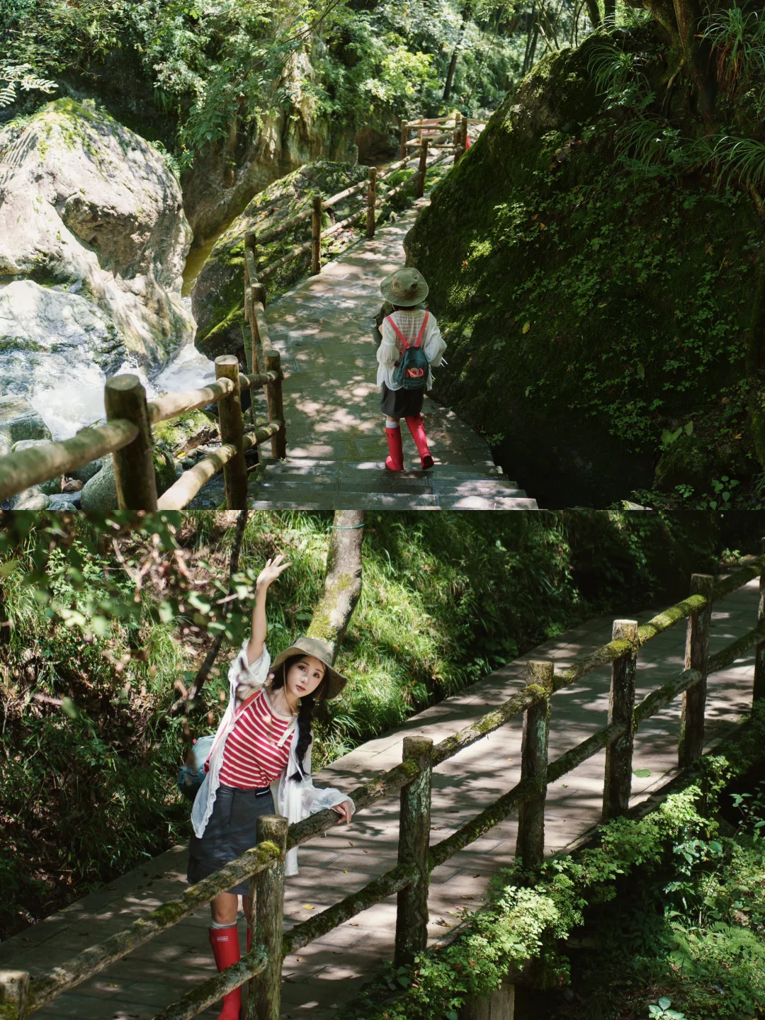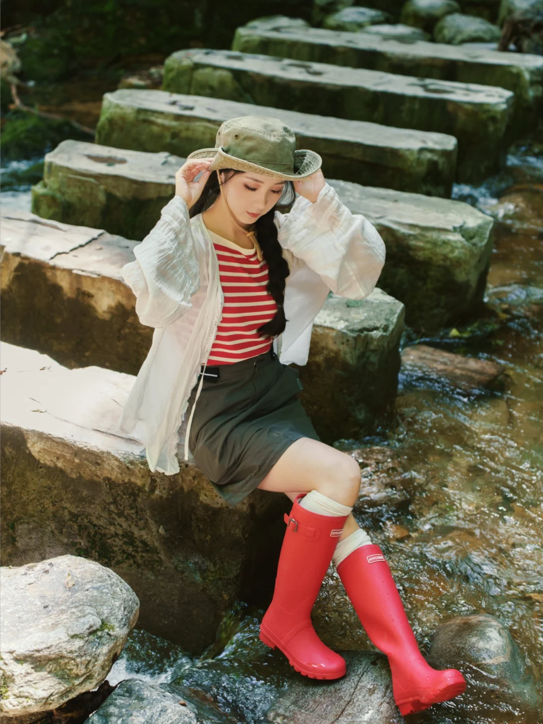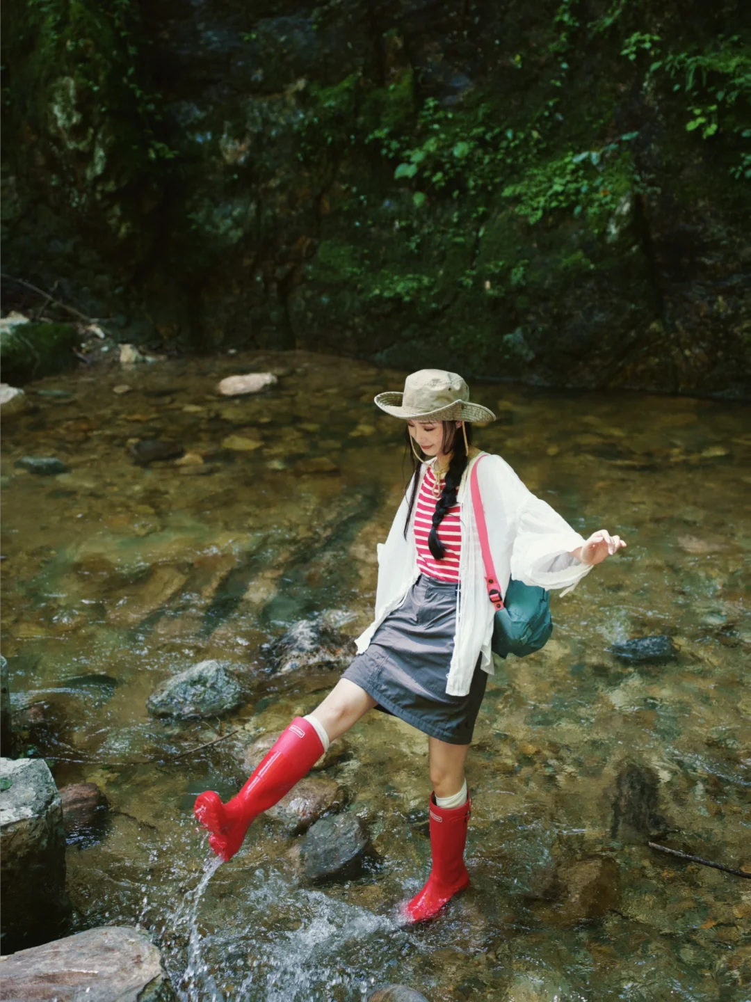 穿着雨靴踩进溪涧,戏水嬉闹