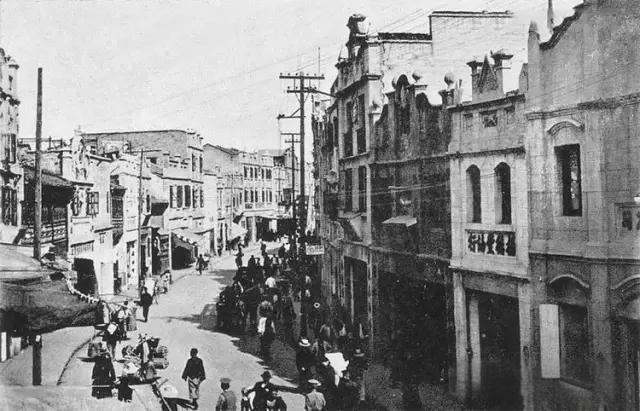 1930年,民国时期九江老城的繁华街景。 街道两侧是中西合璧的骑楼式建筑,既有欧式的立面装饰与拱窗,也保留了中式的临街商铺格局,是当时九江作为通商口岸、中西文化交融的典型体现。 街道上行人熙攘,既有步行的市民,也有往来的人力车,展现出老城的生活活力。纵横交错的电线杆与电线,说明当时的九江已经具备近代城市的基础设施。而建筑外墙上的招牌、商铺的布局,则反映了民国时期九江商业的繁荣与多元。