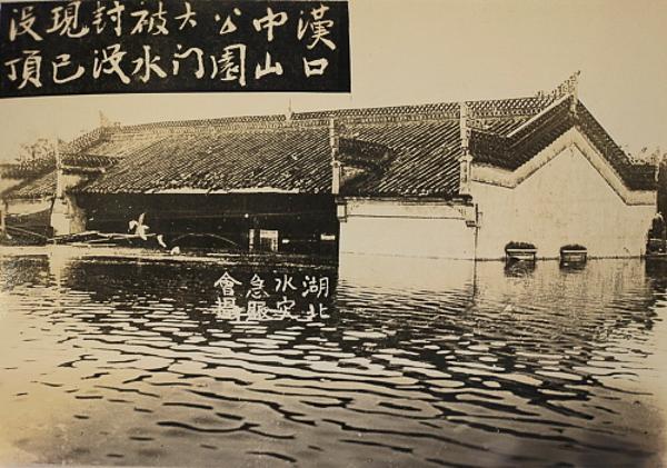 1931年武汉特大洪水期间,汉口中山公园大门被洪水彻底淹没,中式门楼仅露出屋顶部分,整个大门已完全没入水中,水面上漂浮着杂物。 1931年的长江流域特大洪水,导致武汉三镇被洪水围困长达数月。汉口中山公园作为当时重要的城市公共空间,其大门被洪水淹没至屋顶。照片中写着“湖北水灾急赈会摄”的字样清晰可见,体现了当时救灾组织的活动痕迹。
