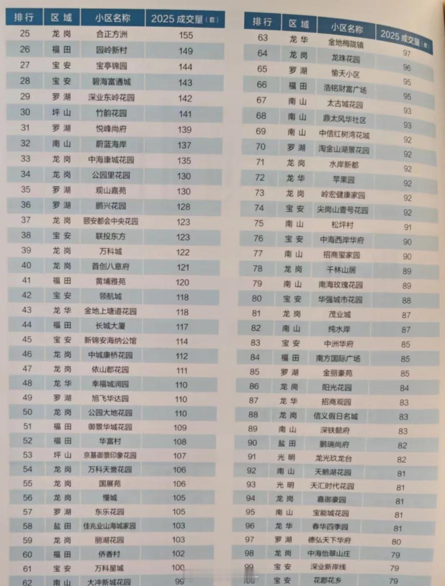 2025年深圳二手成交量排名靠前的楼盘。其实能排在前面的都是超级大社区了。深圳