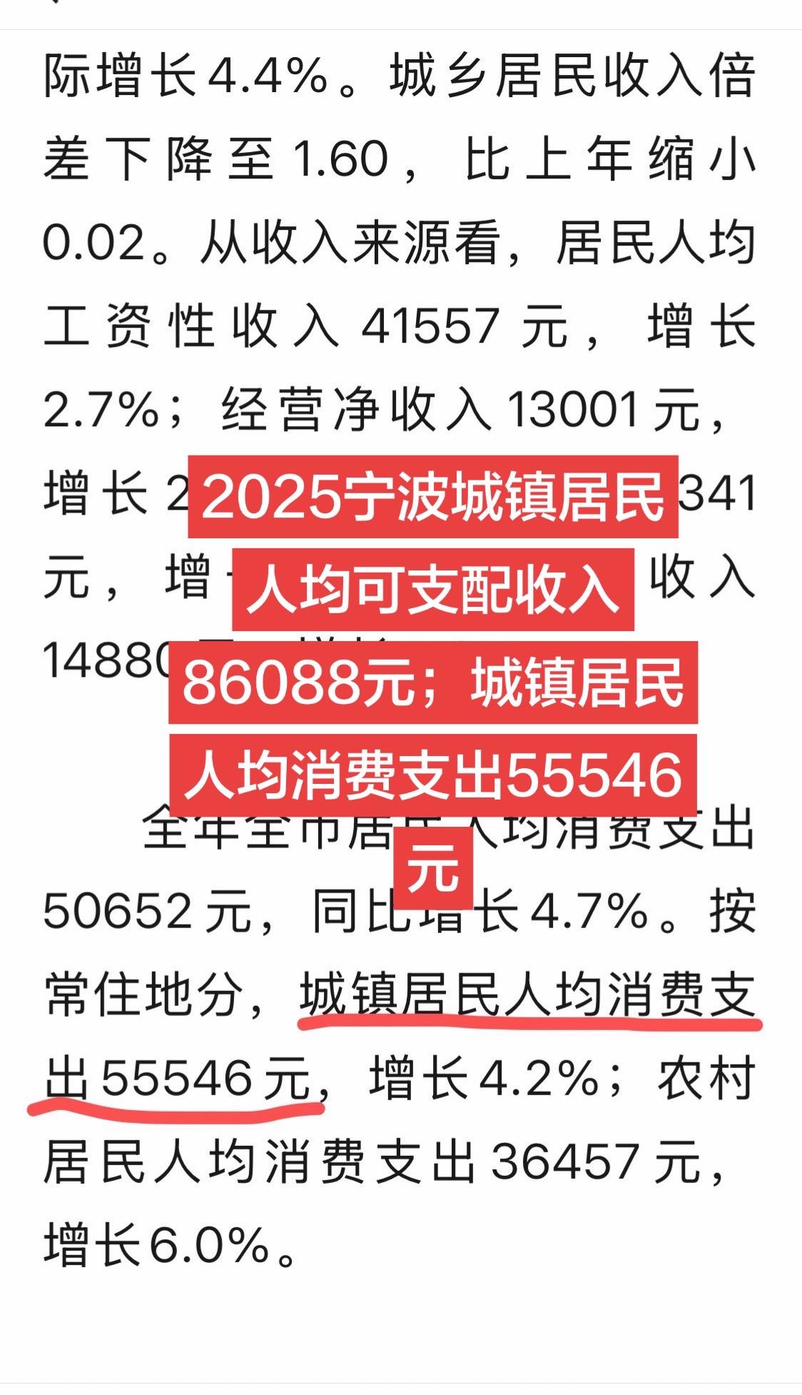 2025宁波城镇居民人均可支配收入86088元;城镇居民人均消费支出55546元