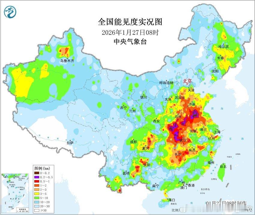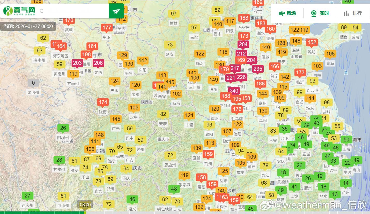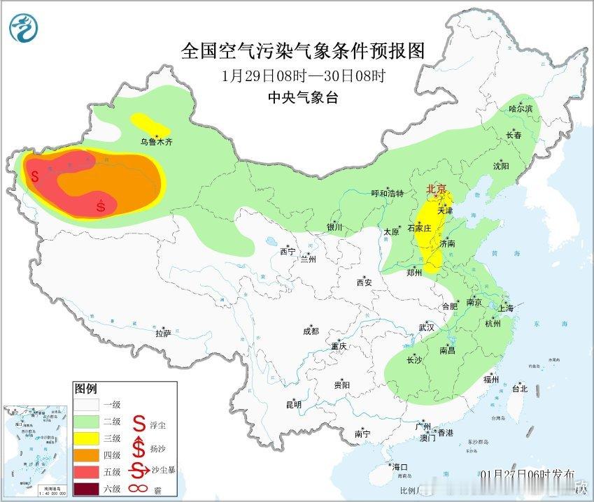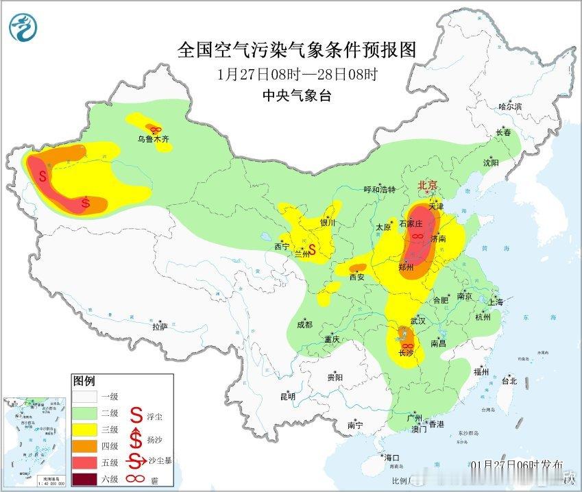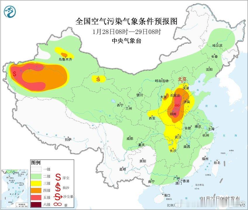 【雾 霾 沙尘】今晨在山东江苏安徽河南湖北的部分地区出现大雾。其中河南邓州、山东滕州、江苏徐州出现了能见度不到50米的特强浓雾。湖北襄阳能见度不足100米,出现强浓雾。从今晨空气质量看,从河北到湖南多地有中度-重度污染,对应有霾。甘肃等地沙尘污染也在持续,但有所减弱。今明甘肃的沙尘继续沉降,总体减弱,新疆塔里木盆地的沙尘还会维持。预计27日至28日,华北中南部、黄淮中西部、汾渭平原等地大气扩散条件较差,有轻至中度霾,部分地区有重度霾,夜间至早晨时段部分地区有大雾。29日至30日,受冷空气和降水共同影响,上述地区雾、霾天气逐渐减弱或消散。
