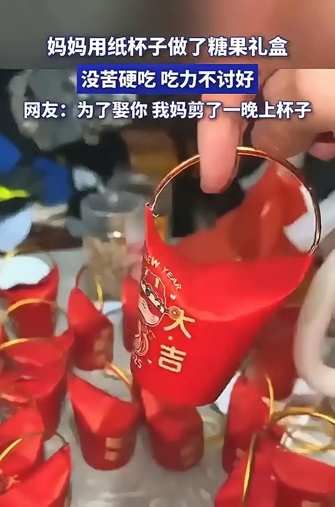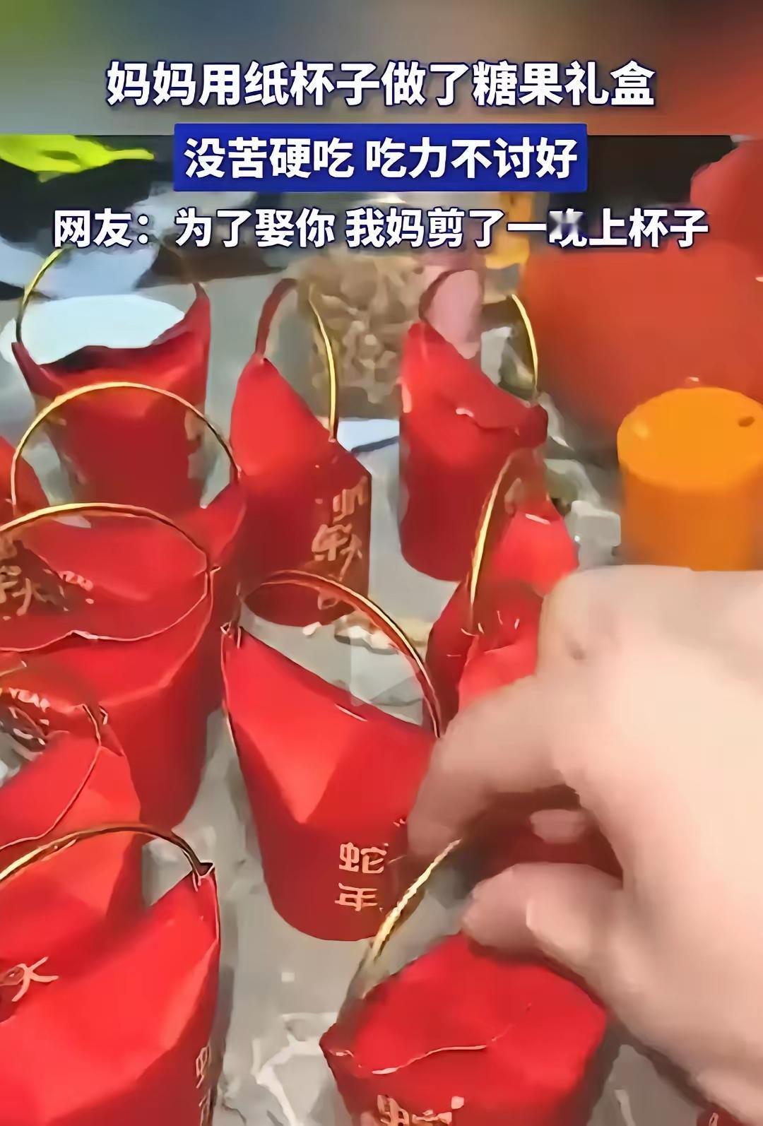 太扎心!某地,一位妈妈为儿子婚礼自制糖果礼盒,本想着既喜庆又省钱,结果却引来网友一片嘲讽。 她一整夜不睡,精心剪金圈、分旺仔糖、订纸杯,满心期待亲戚们能感受到这份用心,可换来的却是“寒碜”“小气”的指责。 这事儿一出来,评论区就炸开了锅。有人觉得婚礼是一辈子一次的大事,就该用成品礼盒,既体面又省事,还显得尊重宾客。毕竟市场上那些礼盒,颜色搭配、尺寸标准,看着就舒服,也不容易出错。可也有人觉得,面子是给别人看的,心意才是无价的。妈妈亲手做的礼盒,红艳艳的纸杯,亮堂堂的金圈,甜滋滋的旺仔糖,每一钉都饱含着爱。 其实,这背后是体面和心意的较劲。婚礼,说到底是两个人的事儿,也是两个家庭的事儿。有人追求仪式感,觉得婚礼就得热热闹闹、体体面面;可也有人更看重心意,觉得只要家人用心,哪怕简简单单,也是最美好的回忆。 在我看来,婚礼的体面和心意并不冲突。体面是外在的表现,心意是内在的情感。妈妈自制礼盒,正是心意的体现,这份爱,不该被几句冷言冷语就否定。而追求体面,也不是错,毕竟谁都想让自己的婚礼完美无缺。 所以,别再用自己的标准去评判别人了。婚礼的形式千千万,重要的是那份爱和祝福。如果是你,你会更看重婚礼的面子还是妈妈的心意呢?遇到这样的评论,你又会怎么回呢?快来聊聊你的看法吧!