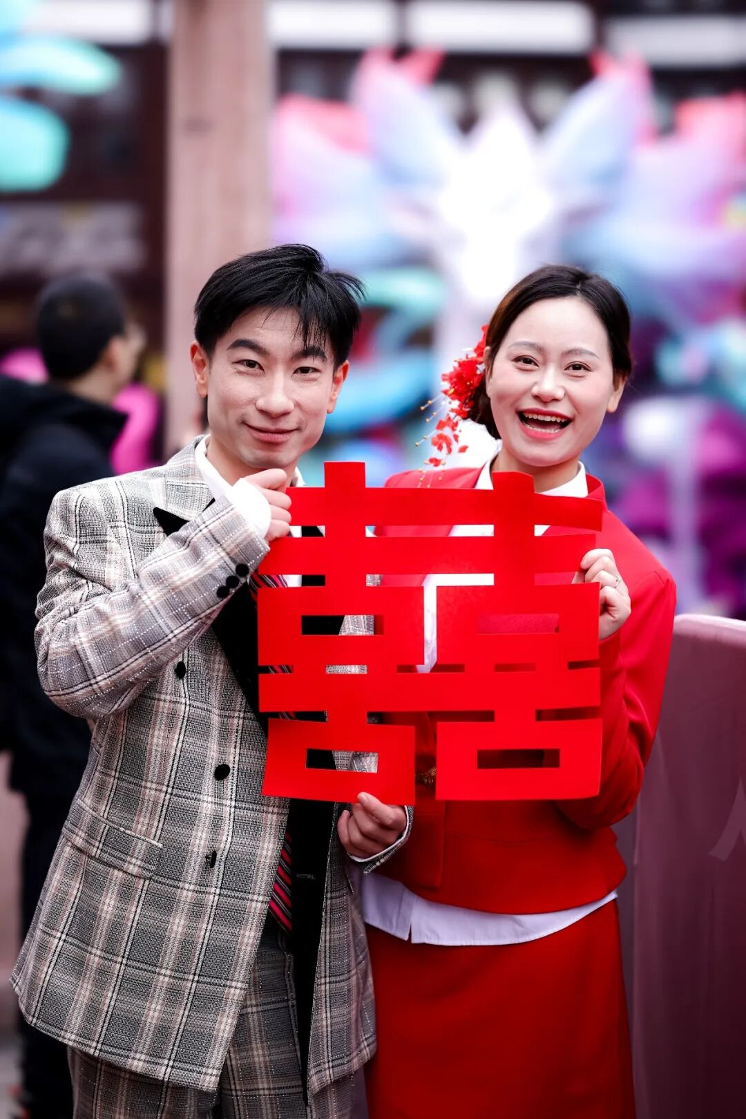 凭借黄浦区独特的文旅资源与文化内核,“爱在黄浦”集体颁证仪式不仅为新婚夫妇拉满仪式感,也成为推动区域旅游的新引擎。从周公馆春日的“海棠情深”到圣三一花园深秋的满地银杏叶,户外颁证依景“排片”,并特邀全国文明家庭代表、道德模范、非遗传承人等为新人颁证,借榜样之力传递婚姻智慧与家国情怀。此外,中心于元宵、七夕等传统节气,在豫园推出“千年婚服变迁”“次元良缘”等夜间主题颁证;借助科技力量,在滨江开展无人机集群飞行送祝福活动,并联动“喜事伙伴”打造“甜蜜集市”,服务对象从年轻新人延伸至金婚银婚夫妇,构建全龄友好的甜蜜仪式场景,实现消费惠享与文明引导的双重功效。