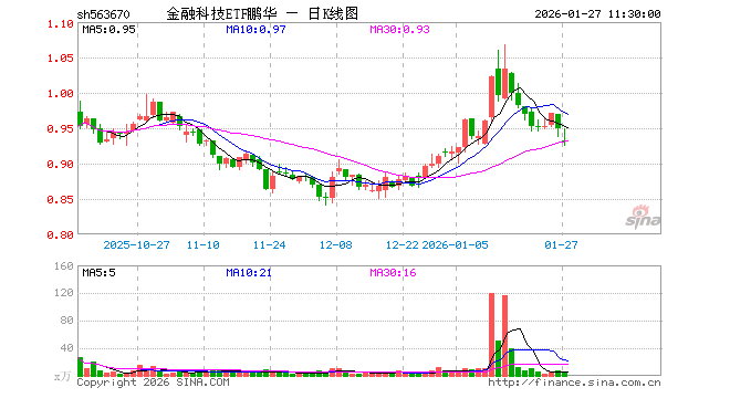 1月27日,截止午间收盘,金融科技ETF鹏华(563670)跌2.11%,报0.930元,成交额517.62万元。金融科技ETF鹏华(563670)重仓股方面,东方财富截止午盘跌1.63%,同花顺跌1.32%,指南针跌2.04%,恒生电子涨0.65%,润和软件跌2.61%,东华软件跌3.70%,新大陆跌2.76%,广电运通跌0.98%,银之杰跌2.22%,四方精创跌2.17%。