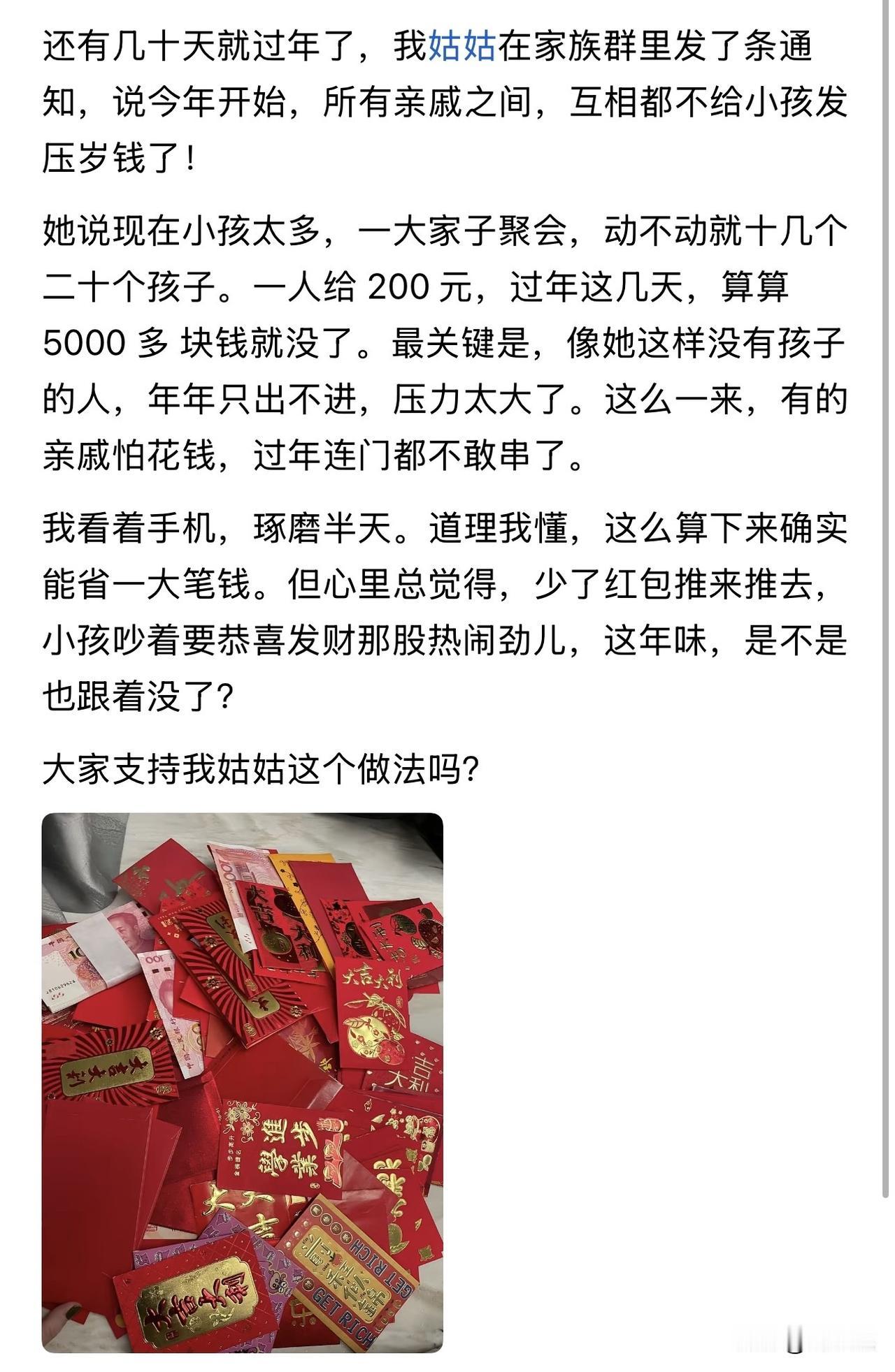客观的说,这位姑姑提的建议也没有毛病,二十多个家长,哪怕每个人给200元压岁钱,5000多元就出去了,还不算其它的开支,确实压力很大。 当然,如果觉得过年不给孩子压岁钱红包少了点年味,那建议每个人封20块钱意思一下,搞个好彩头也行,大家觉得呢?#寻美三湘# #长沙新朋友#
