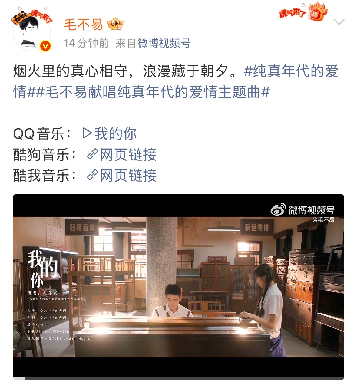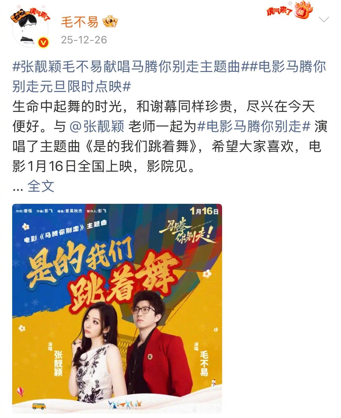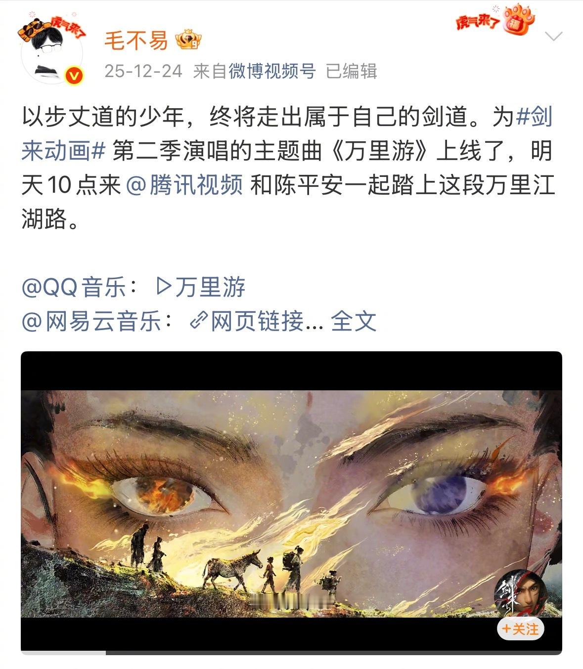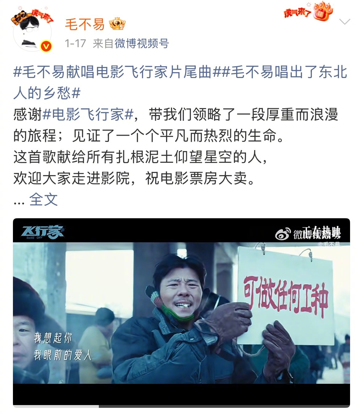 毛不易这人能处过年还给福利 毛不易这人能处过年还记得给粉丝发福利!一个月连发4首OST!《飞行家》《马腾你别走》都是跨年档热门电影,这波过年福利直接把粉丝砸晕,真是听完这首听那首,不愧是我们的宝藏歌手毛老师,这哪是发歌,分明是给乐迷发的过年大礼包!