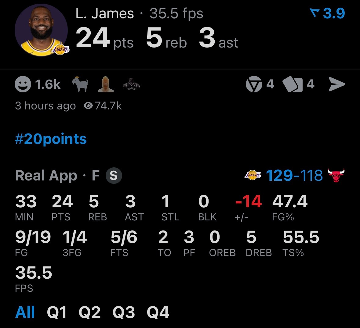 湖人胜公牛,聊四件事。1,除了正负值对詹姆斯不太“友好”,上半场老同志一马当