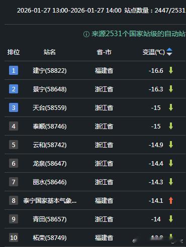 【小范围强降温】今天下午,浙江南部、福建北部出现10℃以上降温。因为昨天处于暖空气区,有光照加热,气温超20℃。今天冷空气到来+阴雨,缺少光照,气温降至10℃以下,形成巨大反差。其中福建建宁降16.6℃,浙江景宁降16.3℃、天台降15℃、泰顺降15℃、云和降14.9℃,排在14时降温榜前五。