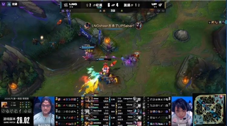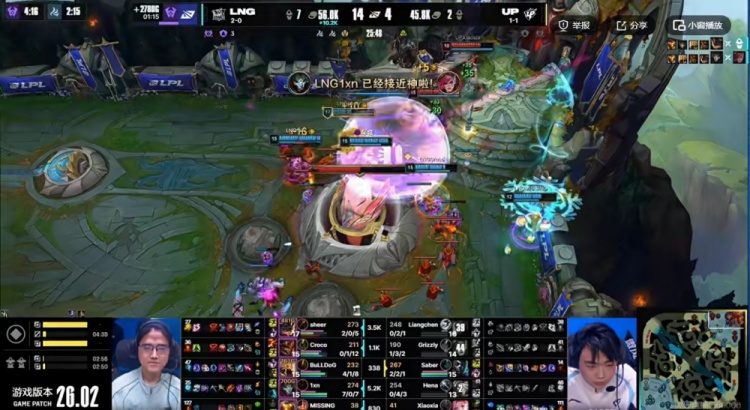 23分钟LNG拿下听牌龙给到压力,随后河道团Saber艾克吃到皇子框大被迫交大,想反打1xn烬结果巴德一个大招让烬躲过了Hena艾希大招,进场的BuLLDoG沙皇推回三个,LNG再打一波0换4,拿下大龙!8K经济优势了!