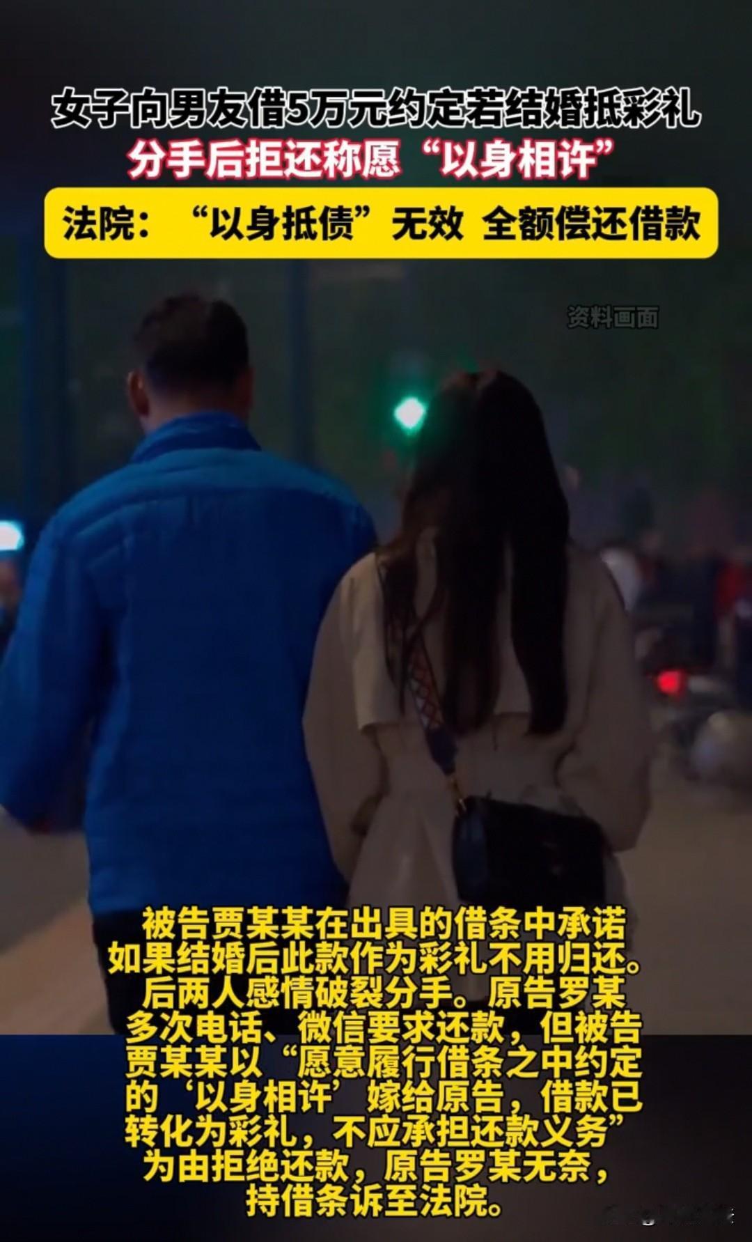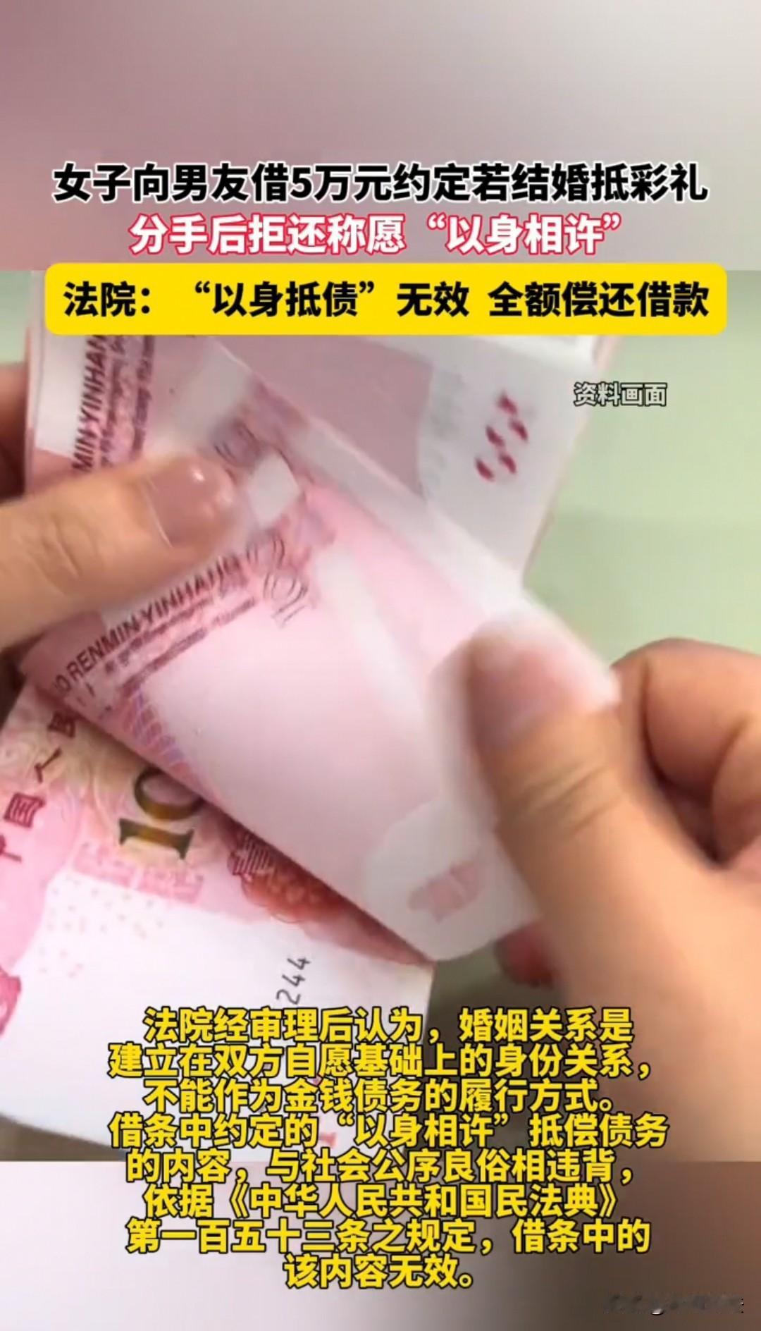 借了5万元不还,只想以身抵债!湖南,女子在网上认识了男子,两人聊得比较开心后就线下见面,后来自然而然地发展成了恋人关系。 这期间,女子的经济出现了问题,她便试着向男友借钱。 她想,如果给家人或者朋友借钱,到时候肯定会催着还的。 如果是给男友借钱,一是看看他是不是对自己真心,二是如果两人以后谈得比较好,会结婚,那么把这部分钱直接转成彩礼,自己也不用还别人钱。 就这样,她想好了后就问自己的男友愿不愿意借给自己5万。 男友觉得可以考虑,毕竟5万不是小数目,他还是得深思熟虑考虑一下自己的经济情况,以及和女友发展的情况。 最后,他答应借给女子,因为他确实想和女子在一起。 不过女子也是一个通情达理的人,她说:“你借给我,我还是要打借条的,虽然我们现在是恋人关系,但是亲兄弟明算账,毕竟我们还没结婚。” 这让男友更加信任女子了,更觉得对方是不可多得的女孩子。 不过女子在写借条的时候,又转头问男友,这笔钱可不可以以后转成彩礼呢?到时候就折算下来,我不用还你这笔钱行不行? 男友当然高兴了,以后娶女子肯定是需要彩礼的,到时候扣下来就行了,这样也不伤害大家的感情,也不担心这笔钱不还自己。 就这样,两人谈妥了,借条也按约定写好了。 可是后来两人相处久了,发现了有很多矛盾,最后闹掰了。 这时男友就找女子还钱了,恋人做不成,那就分得一清二白,该还的还得还给自己。 可是女子拿不出钱来,她便想出了一招:“这样吧,以前不是说如果嫁给你,那就抵彩礼。现在我们性格不同,不能共度余生了,但是我还是履行我们借条中的以身相许的承诺。大致的意思,我就以身抵债吧,你觉得我陪伴你多久能抵5万,那我就陪你多久。” 男子可不答应:“你这是在亵渎我的感情,既然分了,两人就没有关系了,情是情,钱是钱,要分开算。” 但是女子只想以身抵债,不想直接还钱。 最后,男子直接把女子告到了法庭。 法院也作出了公正的判决,认为这种方式去抵债是违背了公序良俗、不合法的,所以不予支持。 因此,借条在手,该还多久就应该多久还。 判决后,双方都没有提起上诉,女子便积极地准备筹钱,还上这5万。 男子念在曾经的感情上,也没有刻意地去追讨,只是希望女方能够遵守承诺,在限期内把钱还给自己。 《民法典》第一百五十三条规定:违背公序良俗的民事法律行为无效。第六百六十七条规定:借款合同是借款人向贷款人借款,到期返还借款并支付利息的合同。 本案中,双方的借款关系合法有效,而“以身抵债”的约定违背公序良俗与人格尊严原则,属于无效条款。 因此法院判决女子需全额偿还5万元借款,明确了人身不能作为债务履行的标的,也维护了公序良俗与法律的严肃性。 对于此事,大家如何看待?素材来源于江西旅游广播