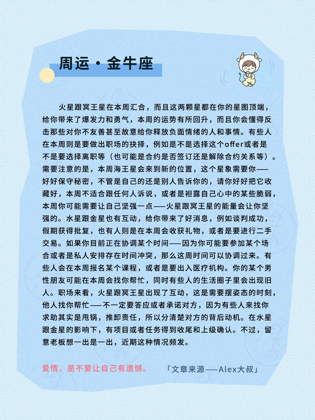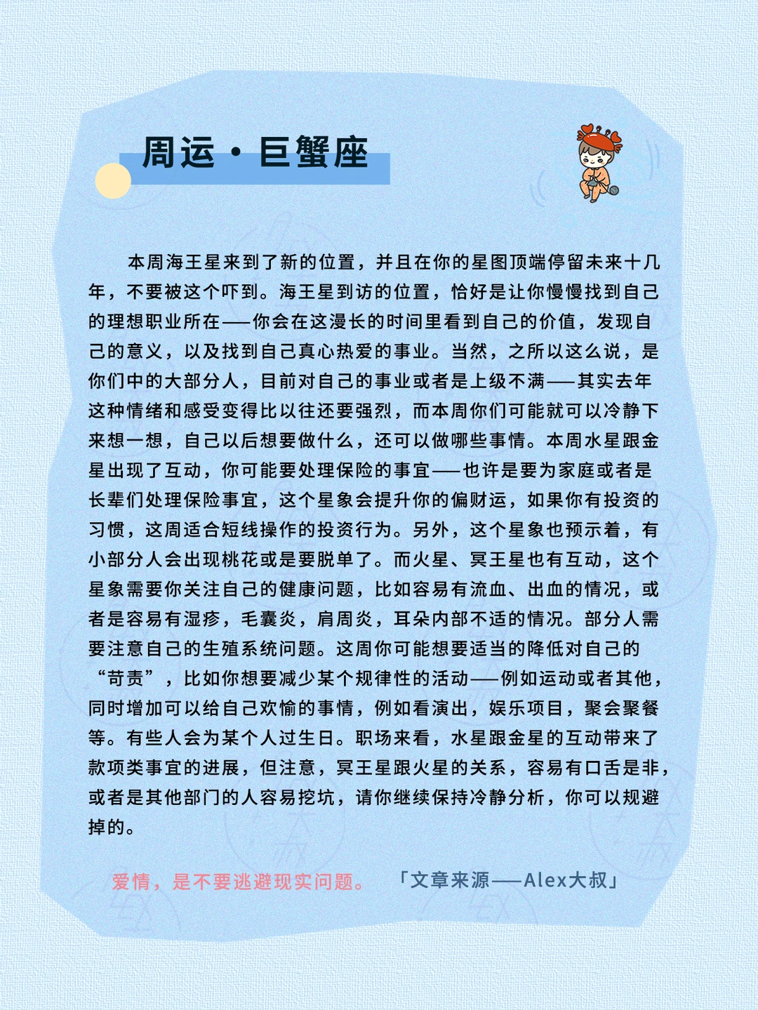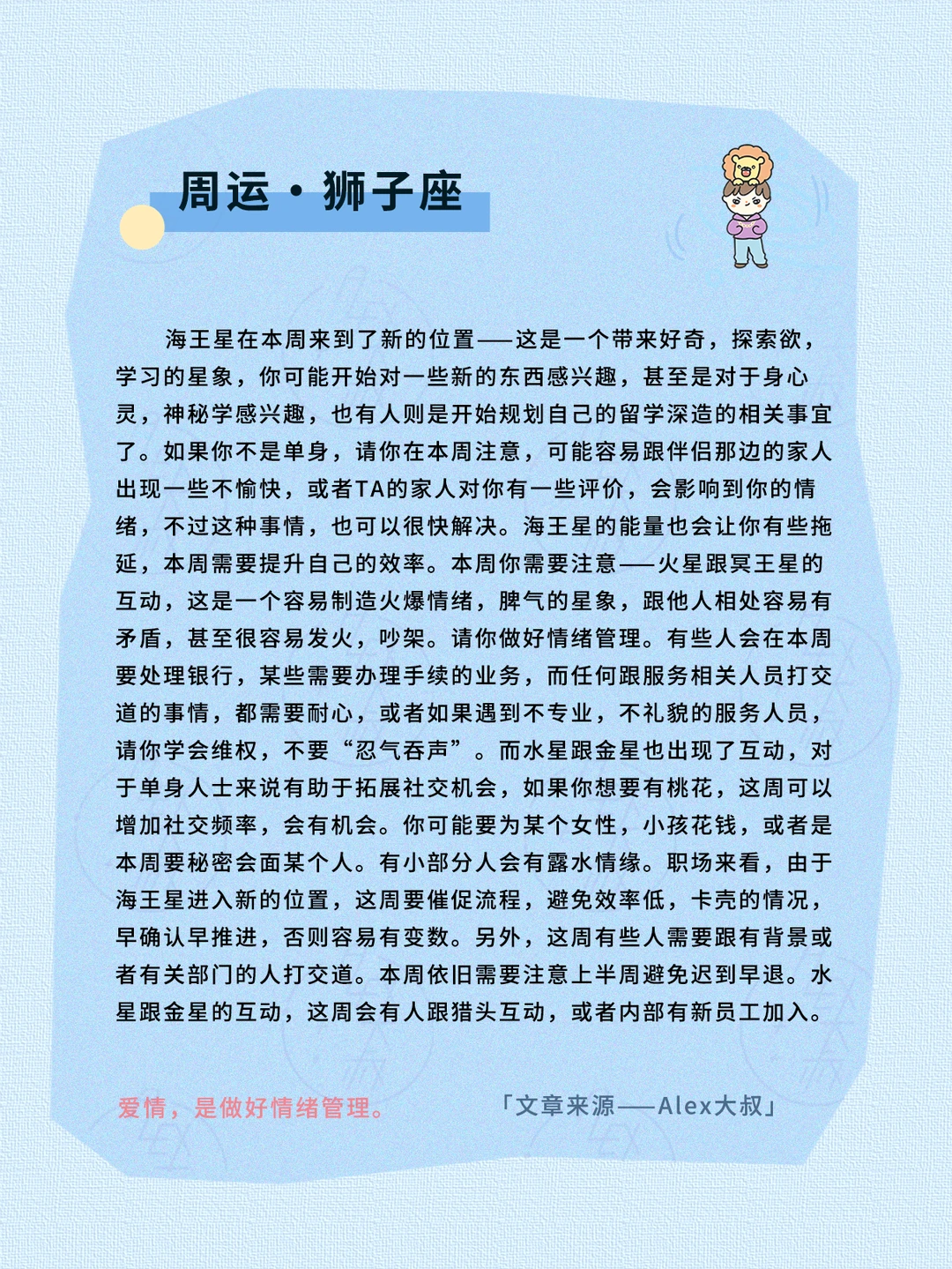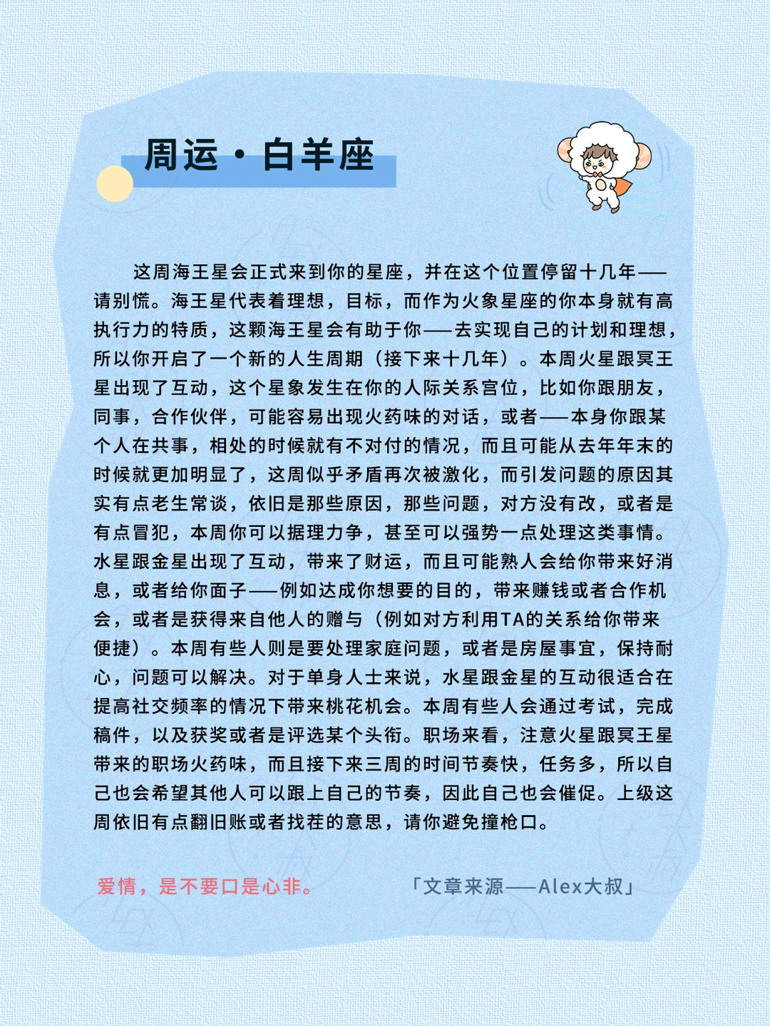 这是非常需要耐心的一周,当海王星出现变化的时候,特别是夹杂了火元素的能量,非常容易失去耐心,暴躁,尤其是上半周——会因为突发状况,手忙脚乱的事情,导致自己情绪不佳,对待亲近之人更容易有一些情绪化表达,使得影响彼此的关系,甚至说出具有伤害性质的话语。